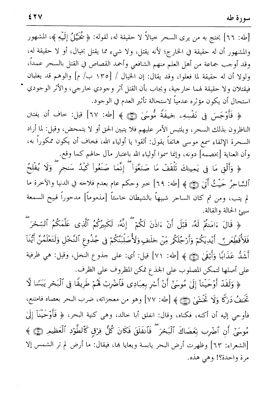 [طه: ٦٦] يحتج به من يرى السحر خيالا لا حقيقة له، لقوله: {يُخَيَّلُ إِلَيْهِ، } المشهور والمشهور أن له حقيقة في الخارج؛ لأنه يقتل، ولا شيء مما يقتل بخيال، أو لا حقيقة له، وقد أوجب جماعة من أهل العلم منهم الشافعي وأحمد القصاص في القتل بالسحر عمدا، ولولا أن له حقيقة لما فعلوا، وقد يقال: إن الخيال/ [١٣٥ ب/م] والوهم قد يغلبان فيقتلان ولا حقيقة لهما خارجية، ويجاب بأن القتل أثر وجودي خارجي، والأثر الوجودي استحال أن يكون مؤثره عدميا لاستحالة تأثير العدم في الوجود.