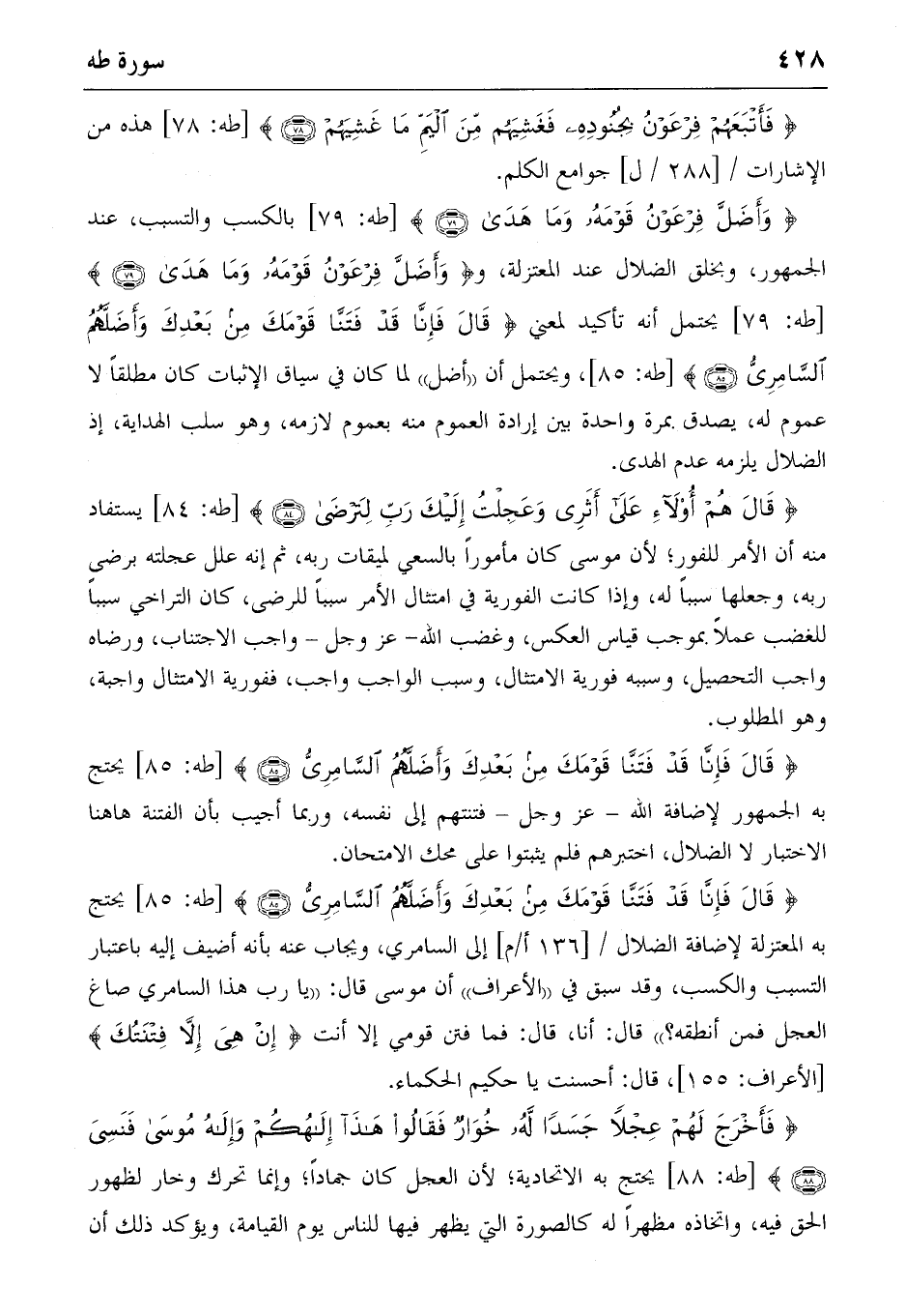 {وَأَضَلَّ فِرْعَوْنُ قَوْمَهُ وَما هَدى} (٧٩) [طه: ٧٩] بالكسب والتسبب، عند الجمهور، وبخلق الضلال عند المعتزلة، و {وَأَضَلَّ فِرْعَوْنُ قَوْمَهُ وَما هَدى} (٧٩) [طه: ٧٩] يحتمل أنه تأكيد لمعني {قالَ فَإِنّا قَدْ فَتَنّا قَوْمَكَ مِنْ بَعْدِكَ وَأَضَلَّهُمُ السّامِرِيُّ} (٨٥) [طه: ٨٥]، ويحتمل أن «أضل» لما كان في سياق الإثبات كان مطلقا لا عموم له، يصدق بمرة واحدة بين إرادة العموم منه بعموم لازمه، وهو سلب الهداية، إذ الضلال يلزمه عدم الهدى.
