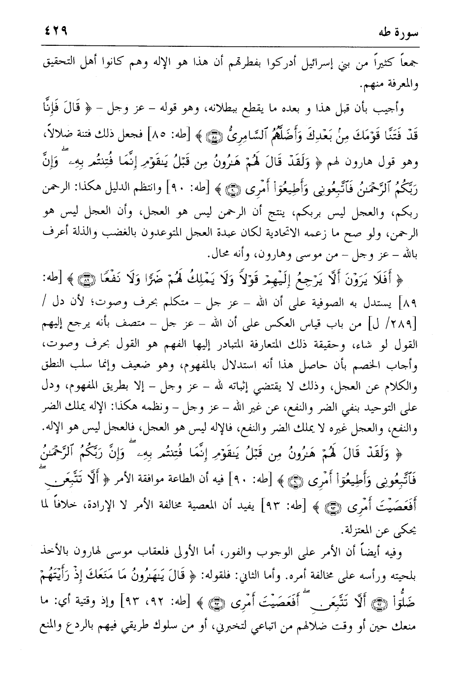 {وَلَقَدْ قالَ لَهُمْ هارُونُ مِنْ قَبْلُ يا قَوْمِ إِنَّما فُتِنْتُمْ بِهِ وَإِنَّ رَبَّكُمُ الرَّحْمنُ فَاتَّبِعُونِي وَأَطِيعُوا أَمْرِي} (٩٠) [طه: ٩٠] فيه أن الطاعة موافقة الأمر {أَلاّ تَتَّبِعَنِ أَفَعَصَيْتَ أَمْرِي} (٩٣) [طه: ٩٣] يفيد أن المعصية مخالفة الأمر لا الإرادة، خلافا لما يحكى عن المعتزلة.