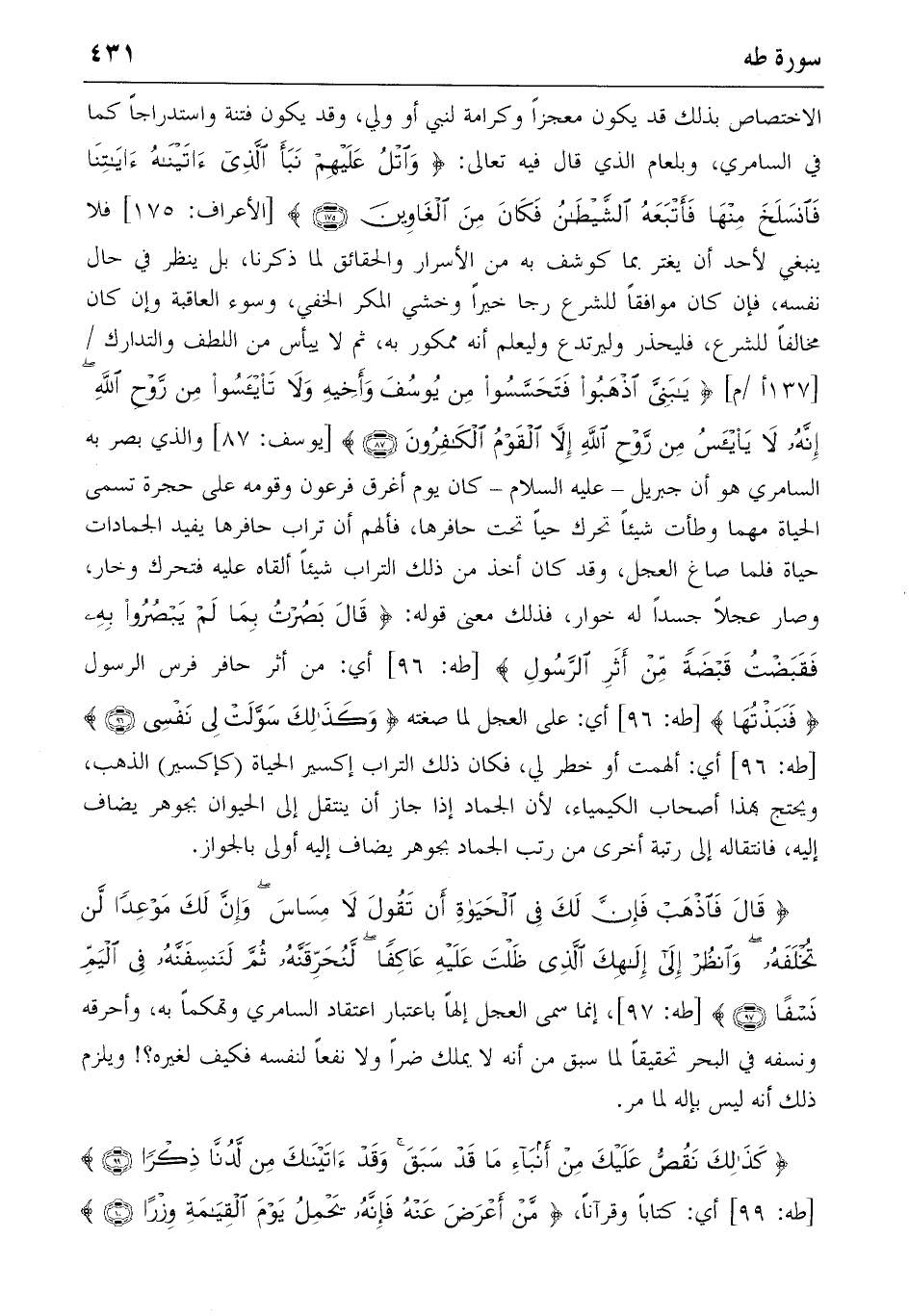 الاختصاص بذلك قد يكون معجزا وكرامة لنبي أو ولي، وقد يكون فتنة واستدراجا كما في السامري، وبلعام الذي قال فيه تعالى: {وَاُتْلُ عَلَيْهِمْ نَبَأَ الَّذِي آتَيْناهُ آياتِنا فَانْسَلَخَ مِنْها فَأَتْبَعَهُ الشَّيْطانُ فَكانَ مِنَ الْغاوِينَ} (١٧٥) [الأعراف: ١٧٥] فلا ينبغي لأحد أن يغتر بما كوشف به من الأسرار والحقائق لما ذكرنا، بل ينظر في حال نفسه، فإن كان موافقا للشرع رجا خيرا وخشي المكر الخفي، وسوء العاقبة وإن كان مخالفا للشرع، فليحذر وليرتدع وليعلم أنه ممكور به، ثم لا ييأس من اللطف والتدارك/ [١٣٧ أ/م] {يا بَنِيَّ اِذْهَبُوا فَتَحَسَّسُوا مِنْ يُوسُفَ وَأَخِيهِ وَلا تَيْأَسُوا مِنْ رَوْحِ اللهِ إِنَّهُ لا يَيْأَسُ مِنْ رَوْحِ اللهِ إِلاَّ الْقَوْمُ الْكافِرُونَ} (٨٧) [يوسف: ٨٧] والذي بصر به السامري هو أن جبريل-عليه السّلام-كان يوم أغرق فرعون وقومه على حجرة تسمى الحياة مهما وطأت شيئا تحرك حيا تحت حافرها، فألهم أن تراب حافرها يفيد الجمادات حياة فلما صاغ العجل، وقد كان أخذ من ذلك التراب شيئا ألقاه عليه فتحرك وخار، وصار عجلا جسدا له خوار، فذلك معنى قوله: {قالَ بَصُرْتُ بِما لَمْ يَبْصُرُوا بِهِ فَقَبَضْتُ قَبْضَةً مِنْ أَثَرِ الرَّسُولِ} (٩٦) [طه: ٩٦] أي: من أثر حافر فرس الرسول {فَنَبَذْتُها} [طه: ٩٦] أي: على العجل لما صغته {وَكَذلِكَ سَوَّلَتْ لِي نَفْسِي} (٩٦) [طه: ٩٦] أي: ألهمت أو خطر لي، فكان ذلك التراب إكسير الحياة (كإكسير) الذهب، ويحتج بهذا أصحاب الكيمياء، لأن الجماد إذا جاز أن ينتقل إلى الحيوان بجوهر يضاف إليه، فانتقاله إلى رتبة أخرى من رتب الجماد بجوهر يضاف إليه أولى بالجواز.