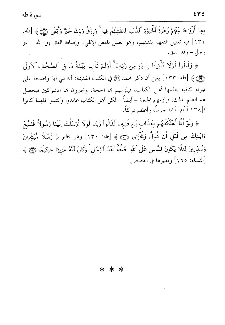 {وَقالُوا لَوْلا يَأْتِينا بِآيَةٍ مِنْ رَبِّهِ أَوَلَمْ تَأْتِهِمْ بَيِّنَةُ ما فِي الصُّحُفِ الْأُولى} (١٣٣) [طه: ١٣٣] يعني أن ذكر محمد صلّى الله عليه وسلّم في الكتب القديمة: أنه نبي آية واضحة على نبوته كافية يعلمها أهل الكتاب، فيلزمهم بها الحجة، ويخبرون بها المشركين فيحصل لهم العلم بذلك، فيلزمهم الحجة-أيضا-لكن أهل الكتاب عاندوا وكتموا فلهذا كانوا / [١٣٨ أ/م] أشد جرما، وأعظم دركا.