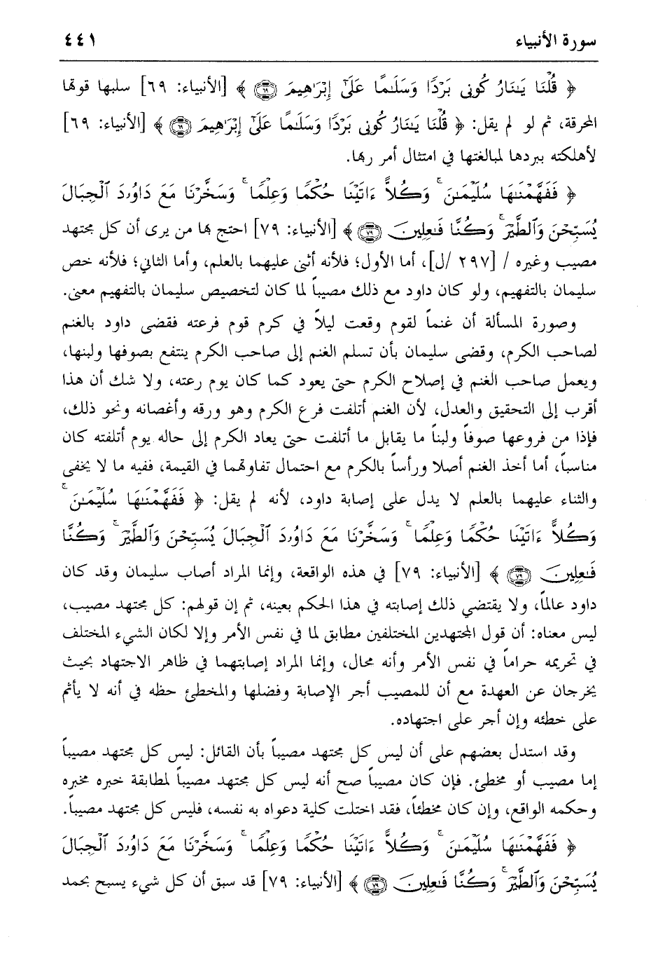 وصورة المسألة أن غنما لقوم وقعت ليلا في كرم قوم فرعته فقضى داود بالغنم لصاحب الكرم، وقضى سليمان بأن تسلم الغنم إلى صاحب الكرم ينتفع بصوفها ولبنها، ويعمل صاحب الغنم في إصلاح الكرم حتى يعود كما كان يوم رعته، ولا شك أن هذا أقرب إلى التحقيق والعدل، لأن الغنم أتلفت فرع الكرم وهو ورقه وأغصانه ونحو ذلك، فإذا من فروعها صوفا ولبنا ما يقابل ما أتلفت حتى يعاد الكرم إلى حاله يوم أتلفته كان مناسبا، أما أخذ الغنم أصلا ورأسا بالكرم مع احتمال تفاوتهما في القيمة، ففيه ما لا يخفى والثناء عليهما بالعلم لا يدل على إصابة داود، لأنه لم يقل: {فَفَهَّمْناها سُلَيْمانَ وَكُلاًّ آتَيْنا حُكْماً وَعِلْماً وَسَخَّرْنا مَعَ داوُدَ الْجِبالَ يُسَبِّحْنَ وَالطَّيْرَ وَكُنّا فاعِلِينَ} (٧٩) [الأنبياء: ٧٩] في هذه الواقعة، وإنما المراد أصاب سليمان وقد كان داود عالما، ولا يقتضي ذلك إصابته في هذا الحكم بعينه، ثم إن قولهم: كل مجتهد مصيب، ليس معناه: أن قول المجتهدين المختلفين مطابق لما في نفس الأمر وإلا لكان الشيء المختلف في تحريمه حراما في نفس الأمر وأنه محال، وإنما المراد إصابتهما في ظاهر الاجتهاد بحيث يخرجان عن العهدة مع أن للمصيب أجر الإصابة وفضلها والمخطئ حظه في أنه لا يأثم على خطئه وإن أجر على اجتهاده.