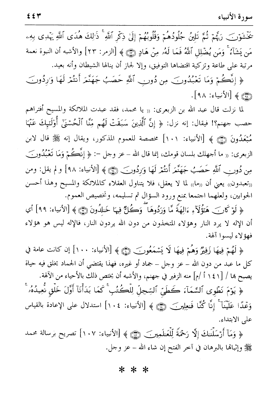 {وَما أَرْسَلْناكَ إِلاّ رَحْمَةً لِلْعالَمِينَ} (١٠٧) [الأنبياء: ١٠٧] تصريح برسالة محمد صلّى الله عليه وسلّم وإثباتها بالبرهان في آخر الفتح إن شاء الله-عز وجل.