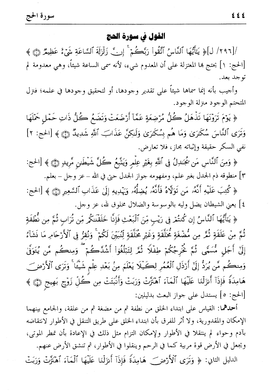 / [٢٩٦/ ل] {يا أَيُّهَا النّاسُ اِتَّقُوا رَبَّكُمْ إِنَّ زَلْزَلَةَ السّاعَةِ شَيْءٌ عَظِيمٌ} (١) [الحج: ١] يحتج بها المعتزلة على أن المعدوم شيء، لأنه سمى الساعة شيئا، وهي معدومة لم توجد بعد.