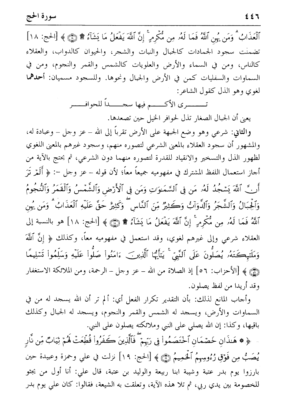 الْعَذابُ وَمَنْ يُهِنِ اللهُ فَما لَهُ مِنْ مُكْرِمٍ إِنَّ اللهَ يَفْعَلُ ما يَشاءُ (١٨) [الحج: ١٨] تضمنت سجود الجمادات كالجبال والنبات والشجر، والحيوان كالدواب، والعقلاء كالناس، ومن في السماء والأرض والعلويات كالشمس والقمر والنجوم، ومن في السماوات والسفليات كمن في الأرض والجبال ونحوها. وللسجود مسميان: أحدهما لغوي وهو الذل كقول الشاعر: