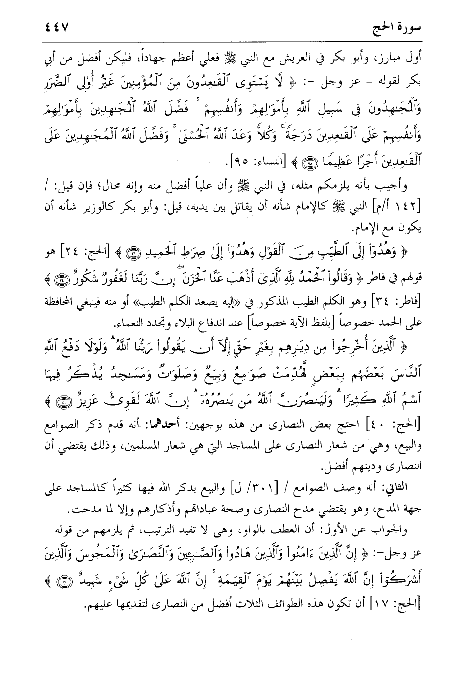 {الَّذِينَ أُخْرِجُوا مِنْ دِيارِهِمْ بِغَيْرِ حَقٍّ إِلاّ أَنْ يَقُولُوا رَبُّنَا اللهُ وَلَوْلا دَفْعُ اللهِ النّاسَ بَعْضَهُمْ بِبَعْضٍ لَهُدِّمَتْ صَوامِعُ وَبِيَعٌ وَصَلَواتٌ وَمَساجِدُ يُذْكَرُ فِيهَا اِسْمُ اللهِ كَثِيراً وَلَيَنْصُرَنَّ اللهُ مَنْ يَنْصُرُهُ إِنَّ اللهَ لَقَوِيٌّ عَزِيزٌ} (٤٠) [الحج: ٤٠] احتج بعض النصارى من هذه بوجهين: أحدهما: أنه قدم ذكر الصوامع والبيع، وهي من شعار النصارى على المساجد التي هي شعار المسلمين، وذلك يقتضي أن النصارى ودينهم أفضل.