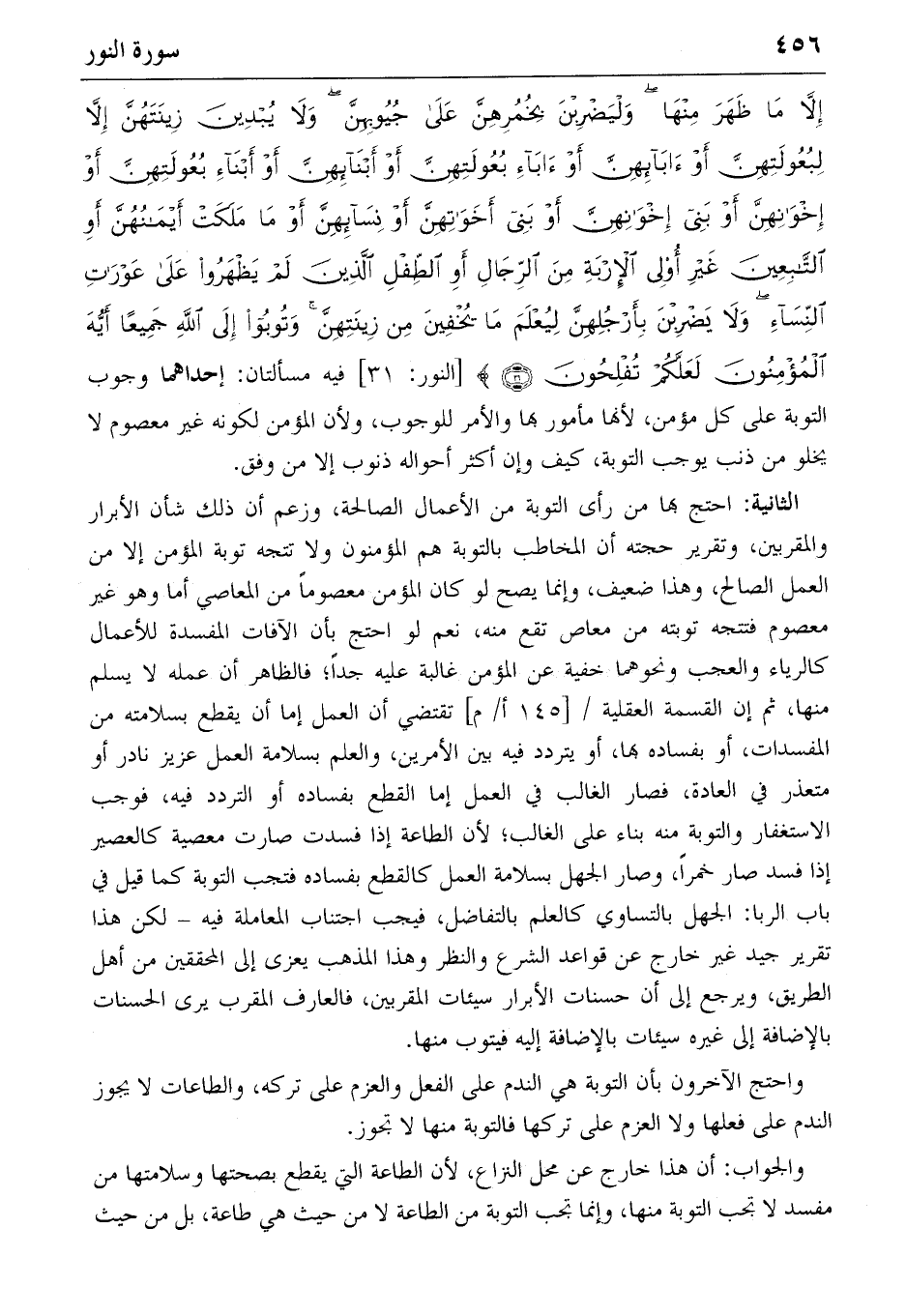 إِلاّ ما ظَهَرَ مِنْها وَلْيَضْرِبْنَ بِخُمُرِهِنَّ عَلى جُيُوبِهِنَّ وَلا يُبْدِينَ زِينَتَهُنَّ إِلاّ لِبُعُولَتِهِنَّ أَوْ آبائِهِنَّ أَوْ آباءِ بُعُولَتِهِنَّ أَوْ أَبْنائِهِنَّ أَوْ أَبْناءِ بُعُولَتِهِنَّ أَوْ إِخْوانِهِنَّ أَوْ بَنِي إِخْوانِهِنَّ أَوْ بَنِي أَخَواتِهِنَّ أَوْ نِسائِهِنَّ أَوْ ما مَلَكَتْ أَيْمانُهُنَّ أَوِ التّابِعِينَ غَيْرِ أُولِي الْإِرْبَةِ مِنَ الرِّجالِ أَوِ الطِّفْلِ الَّذِينَ لَمْ يَظْهَرُوا عَلى عَوْراتِ النِّساءِ وَلا يَضْرِبْنَ بِأَرْجُلِهِنَّ لِيُعْلَمَ ما يُخْفِينَ مِنْ زِينَتِهِنَّ وَتُوبُوا إِلَى اللهِ جَمِيعاً أَيُّهَا الْمُؤْمِنُونَ لَعَلَّكُمْ تُفْلِحُونَ (٣١) [النور: ٣١] فيه مسألتان: إحداهما وجوب التوبة على كل مؤمن، لأنها مأمور بها والأمر للوجوب، ولأن المؤمن لكونه غير معصوم لا يخلو من ذنب يوجب التوبة، كيف وإن أكثر أحواله ذنوب إلا من وفق.