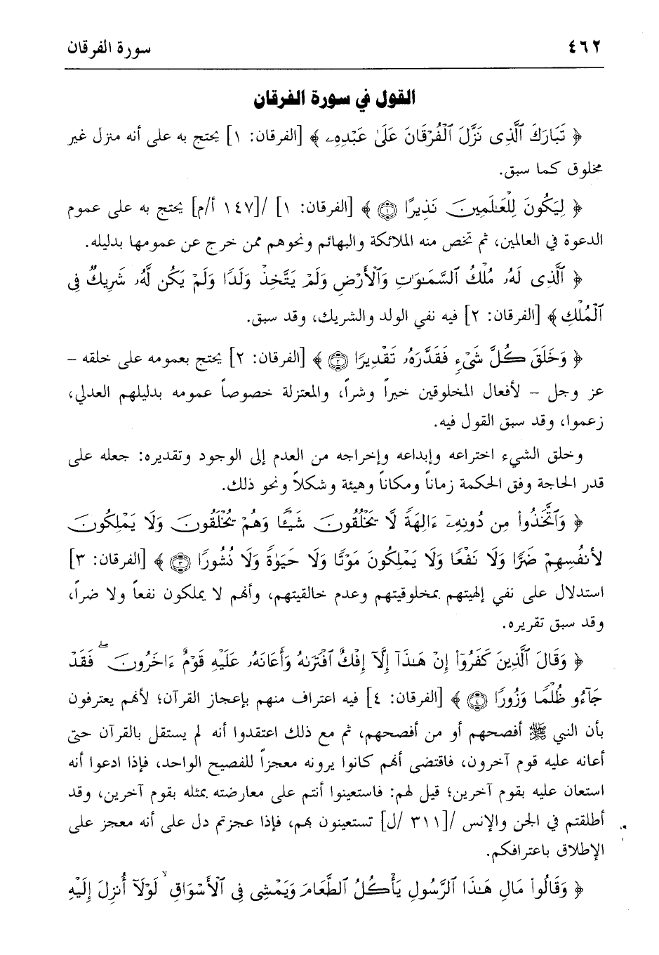 {تَبارَكَ الَّذِي نَزَّلَ الْفُرْقانَ عَلى عَبْدِهِ} [الفرقان: ١] يحتج به على أنه منزل غير مخلوق كما سبق.