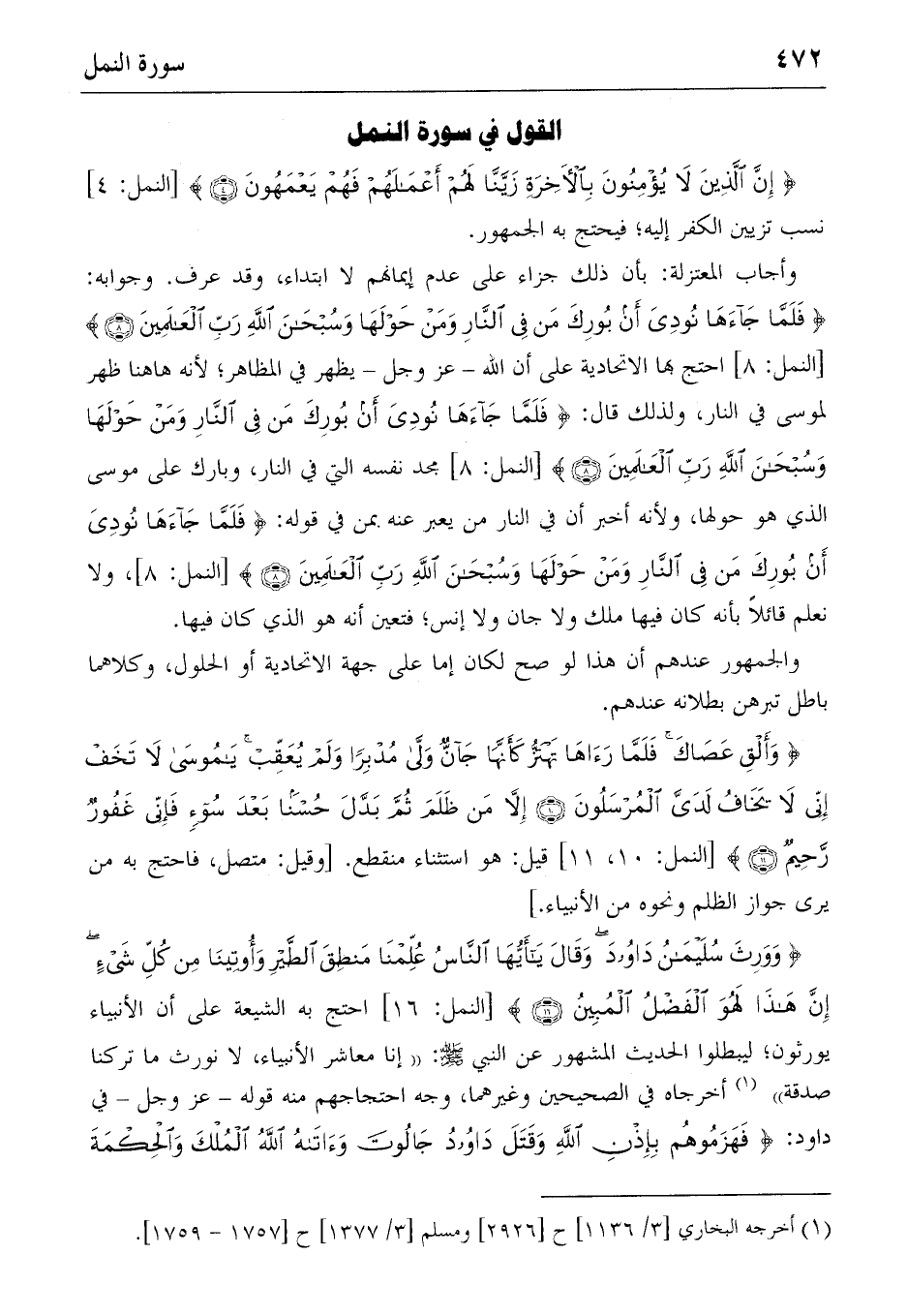 {فَلَمّا جاءَها نُودِيَ أَنْ بُورِكَ مَنْ فِي النّارِ وَمَنْ حَوْلَها وَسُبْحانَ اللهِ رَبِّ الْعالَمِينَ} (٨) [النمل: ٨] احتج بها الاتحادية على أن الله-عز وجل-يظهر في المظاهر؛ لأنه هاهنا ظهر لموسى في النار، ولذلك قال: {فَلَمّا جاءَها نُودِيَ أَنْ بُورِكَ مَنْ فِي النّارِ وَمَنْ حَوْلَها وَسُبْحانَ اللهِ رَبِّ الْعالَمِينَ} (٨) [النمل: ٨] مجد نفسه التي في النار، وبارك على موسى الذي هو حولها، ولأنه أخبر أن في النار من يعبر عنه بمن في قوله: {فَلَمّا جاءَها نُودِيَ أَنْ بُورِكَ مَنْ فِي النّارِ وَمَنْ حَوْلَها وَسُبْحانَ اللهِ رَبِّ الْعالَمِينَ} (٨) [النمل: ٨]، ولا نعلم قائلا بأنه كان فيها ملك ولا جان ولا إنس؛ فتعين أنه هو الذي كان فيها.