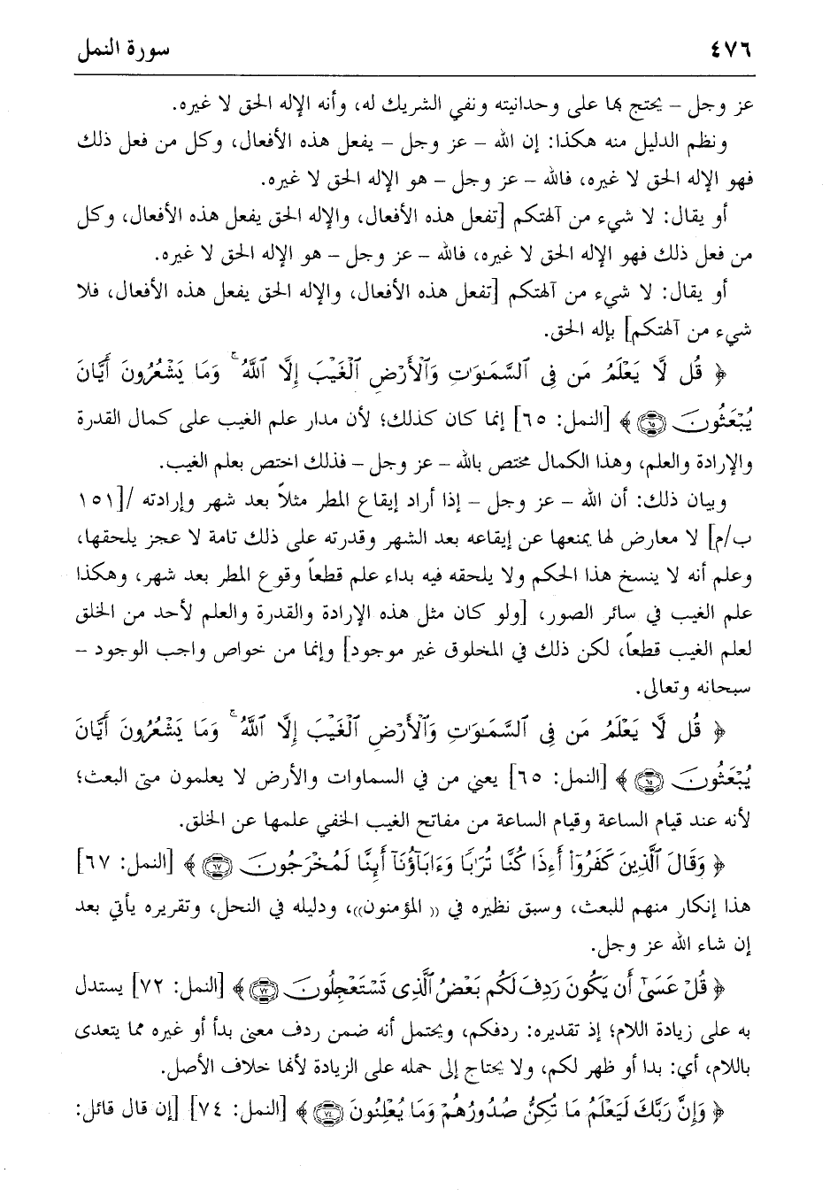 {قُلْ لا يَعْلَمُ مَنْ فِي السَّماواتِ وَالْأَرْضِ الْغَيْبَ إِلاَّ اللهُ وَما يَشْعُرُونَ أَيّانَ يُبْعَثُونَ} (٦٥) [النمل: ٦٥] إنما كان كذلك؛ لأن مدار علم الغيب على كمال القدرة والإرادة والعلم، وهذا الكمال مختص بالله-عز وجل-فذلك اختص بعلم الغيب.