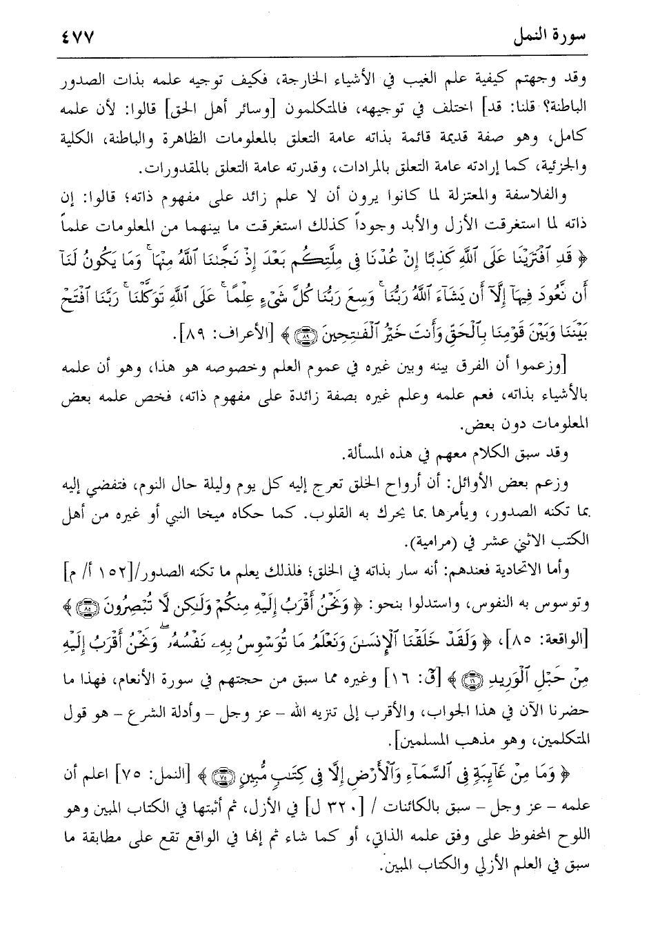 والفلاسفة والمعتزلة لما كانوا يرون أن لا علم زائد على مفهوم ذاته؛ قالوا: إن ذاته لما استغرقت الأزل والأبد وجودا كذلك استغرقت ما بينهما من المعلومات علما {قَدِ اِفْتَرَيْنا عَلَى اللهِ كَذِباً إِنْ عُدْنا فِي مِلَّتِكُمْ بَعْدَ إِذْ نَجّانَا اللهُ مِنْها وَما يَكُونُ لَنا أَنْ نَعُودَ فِيها إِلاّ أَنْ يَشاءَ اللهُ رَبُّنا وَسِعَ رَبُّنا كُلَّ شَيْءٍ عِلْماً عَلَى اللهِ تَوَكَّلْنا رَبَّنَا اِفْتَحْ بَيْنَنا وَبَيْنَ قَوْمِنا بِالْحَقِّ وَأَنْتَ خَيْرُ الْفاتِحِينَ} (٨٩) [الأعراف: ٨٩].