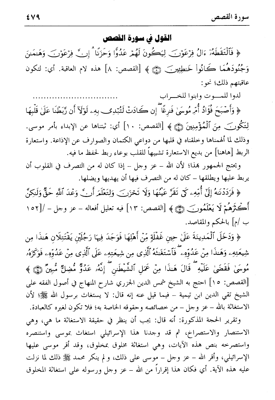 {وَدَخَلَ الْمَدِينَةَ عَلى حِينِ غَفْلَةٍ مِنْ أَهْلِها فَوَجَدَ فِيها رَجُلَيْنِ يَقْتَتِلانِ هذا مِنْ شِيعَتِهِ وَهذا مِنْ عَدُوِّهِ فَاسْتَغاثَهُ الَّذِي مِنْ شِيعَتِهِ عَلَى الَّذِي مِنْ عَدُوِّهِ فَوَكَزَهُ مُوسى فَقَضى عَلَيْهِ قالَ هذا مِنْ عَمَلِ الشَّيْطانِ إِنَّهُ عَدُوٌّ مُضِلٌّ مُبِينٌ} (١٥) [القصص: ١٥] احتج به الشيخ شمس الدين الجزري شارح المنهاج في أصول الفقه على الشيخ تقي الدين ابن تيمية-فيما قيل عنه إنه قال: لا يستغاث برسول الله صلّى الله عليه وسلّم؛ لأن الاستغاثة بالله-عز وجل-من خصائصه وحقوقه الخاصة به؛ فلا تكون لغيره كالعبادة.