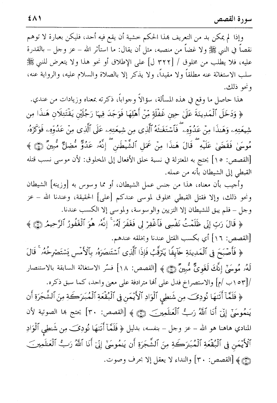 {وَدَخَلَ الْمَدِينَةَ عَلى حِينِ غَفْلَةٍ مِنْ أَهْلِها فَوَجَدَ فِيها رَجُلَيْنِ يَقْتَتِلانِ هذا مِنْ شِيعَتِهِ وَهذا مِنْ عَدُوِّهِ فَاسْتَغاثَهُ الَّذِي مِنْ شِيعَتِهِ عَلَى الَّذِي مِنْ عَدُوِّهِ فَوَكَزَهُ مُوسى فَقَضى عَلَيْهِ قالَ هذا مِنْ عَمَلِ الشَّيْطانِ إِنَّهُ عَدُوٌّ مُضِلٌّ مُبِينٌ} (١٥) [القصص: ١٥] يحتج به المعتزلة في نسبة خلق الأفعال إلى المخلوق: لأن موسى نسب قتله القبطي إلى الشيطان بأنه من عمله.