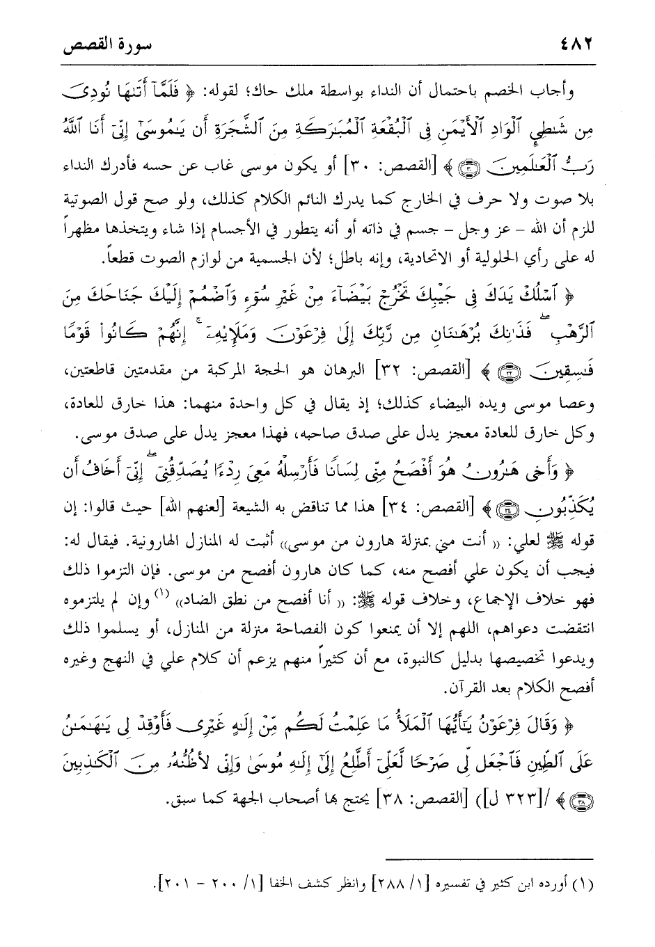 {وَأَخِي هارُونُ هُوَ أَفْصَحُ مِنِّي لِساناً فَأَرْسِلْهُ مَعِي رِدْءاً يُصَدِّقُنِي إِنِّي أَخافُ أَنْ يُكَذِّبُونِ} (٣٤) [القصص: ٣٤] هذا مما تناقض به الشيعة [لعنهم الله] حيث قالوا: إن قوله صلّى الله عليه وسلّم لعلي: «أنت مني بمنزلة هارون من موسى» أثبت له المنازل الهارونية. فيقال له: