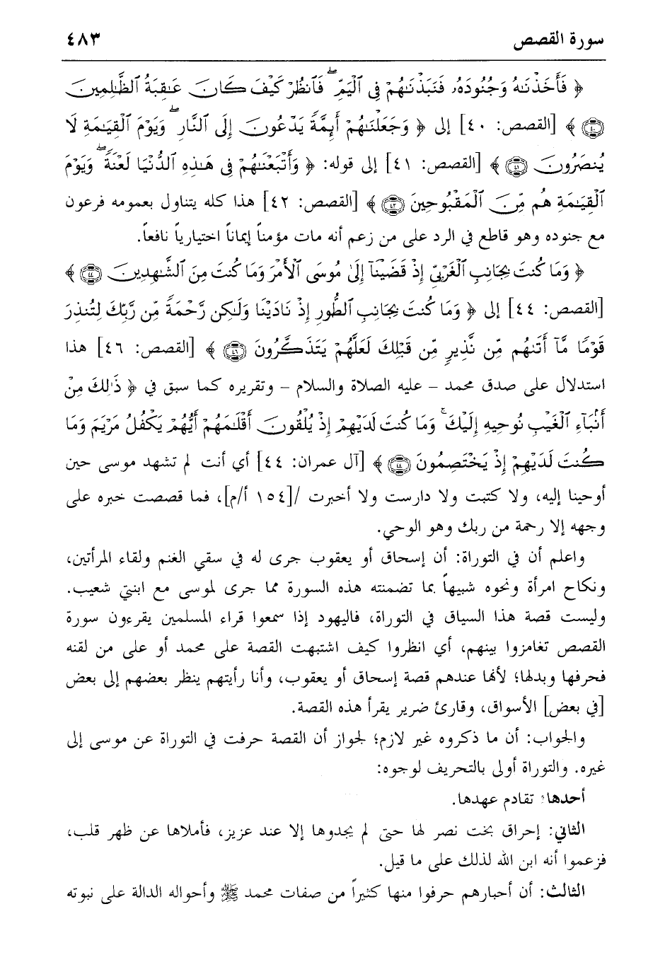 وليست قصة هذا السياق في التوراة، فاليهود إذا سمعوا قراء المسلمين يقرءون سورة القصص تغامزوا بينهم، أي انظروا كيف اشتبهت القصة على محمد أو على من لقنه فحرفها وبدلها؛ لأنها عندهم قصة إسحاق أو يعقوب، وأنا رأيتهم ينظر بعضهم إلى بعض [في بعض] الأسواق، وقارئ ضرير يقرأ هذه القصة.