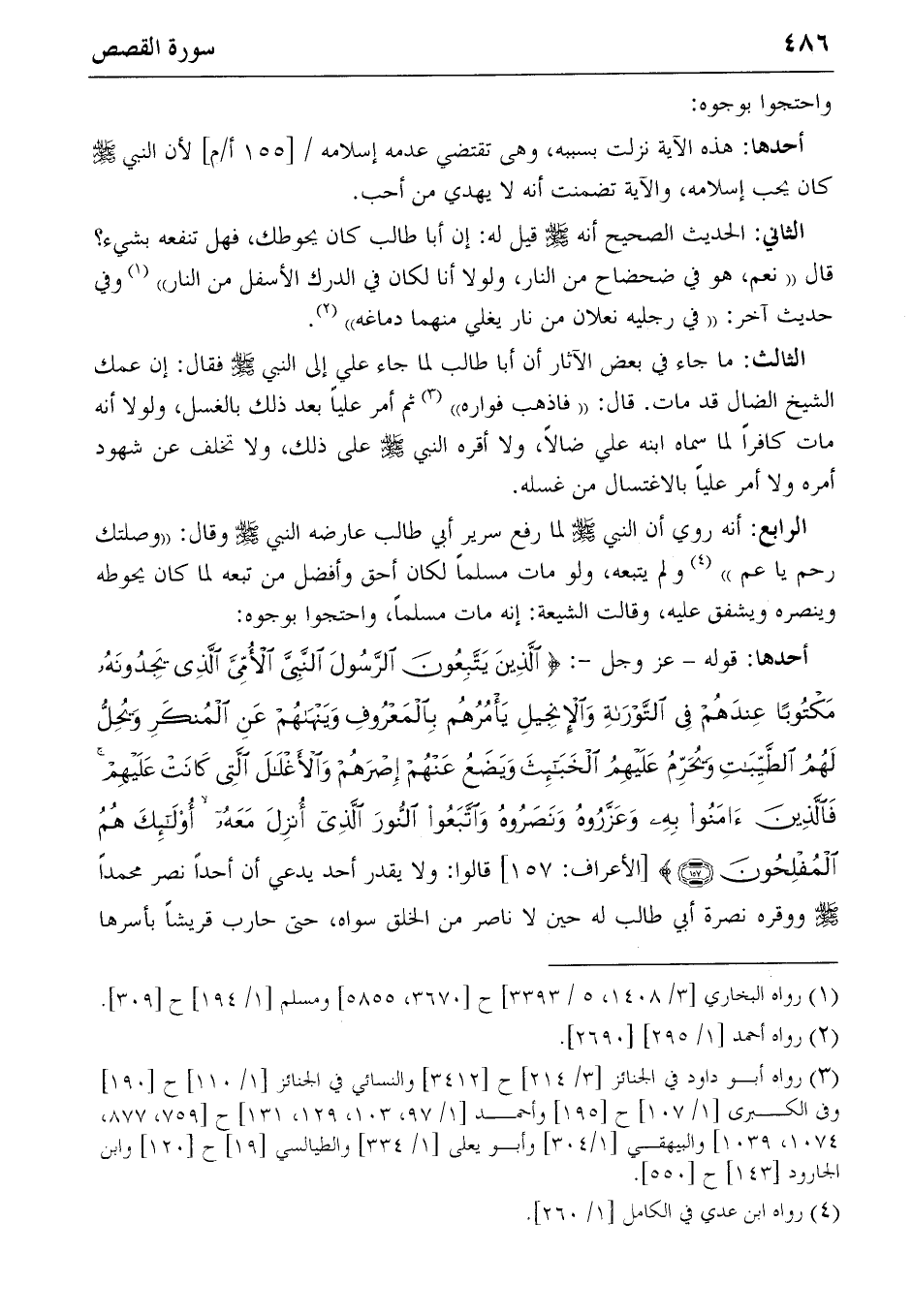 الرابع: أنه روي أن النبي صلّى الله عليه وسلّم لما رفع سرير أبي طالب عارضه النبي صلّى الله عليه وسلّم وقال: «وصلتك رحم يا عم» (٤) ولم يتبعه، ولو مات مسلما لكان أحق وأفضل من تبعه لما كان يحوطه وينصره ويشفق عليه، وقالت الشيعة: إنه مات مسلما، واحتجوا بوجوه: