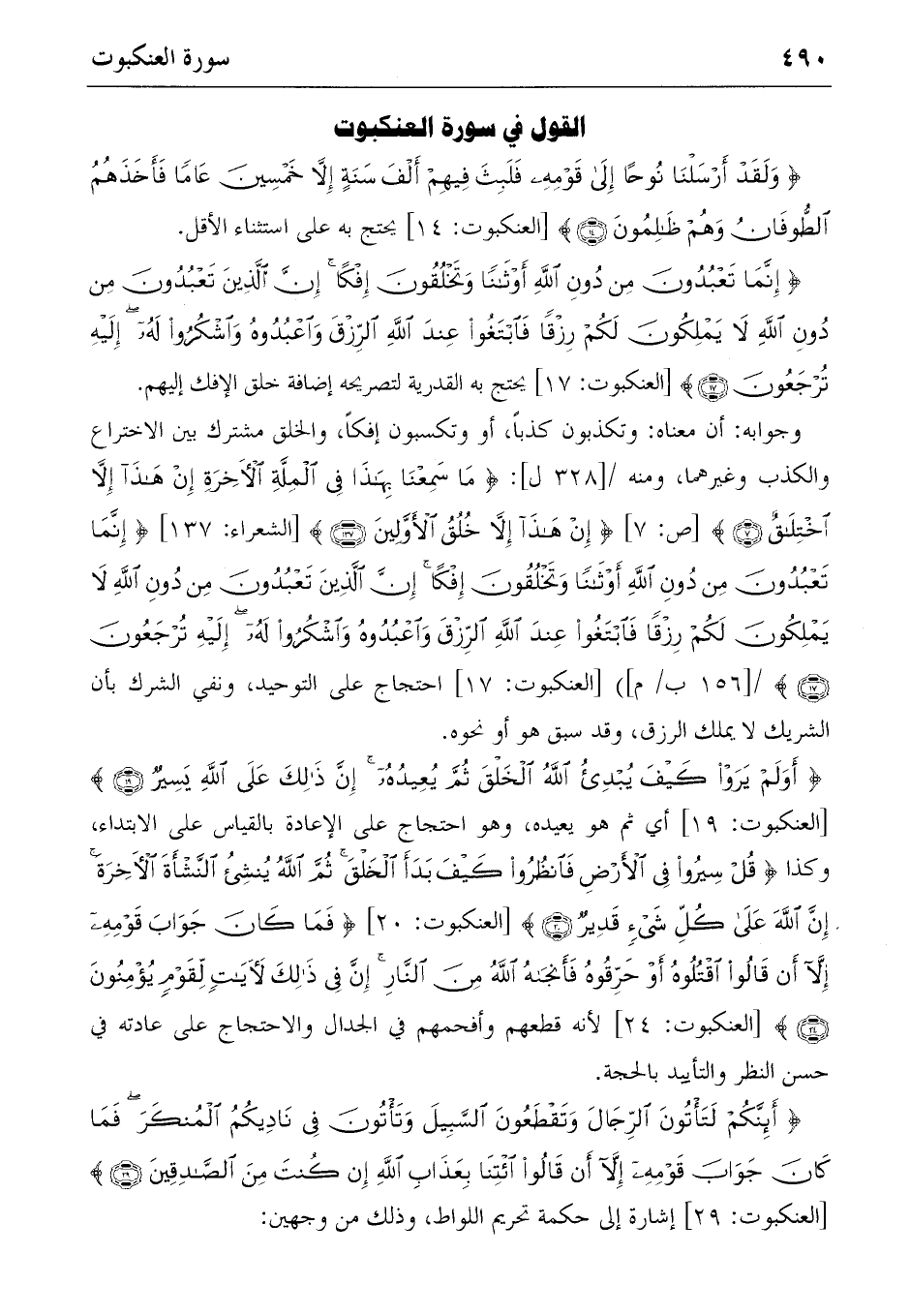 {أَوَلَمْ يَرَوْا كَيْفَ يُبْدِئُ اللهُ الْخَلْقَ ثُمَّ يُعِيدُهُ إِنَّ ذلِكَ عَلَى اللهِ يَسِيرٌ} (١٩) [العنكبوت: ١٩] أي ثم هو يعيده، وهو احتجاج على الإعادة بالقياس على الابتداء، وكذا {قُلْ سِيرُوا فِي الْأَرْضِ فَانْظُرُوا كَيْفَ بَدَأَ الْخَلْقَ ثُمَّ اللهُ يُنْشِئُ النَّشْأَةَ الْآخِرَةَ إِنَّ اللهَ عَلى كُلِّ شَيْءٍ قَدِيرٌ} (٢٠) [العنكبوت: ٢٠] {فَما كانَ جَوابَ قَوْمِهِ إِلاّ أَنْ قالُوا اُقْتُلُوهُ أَوْ حَرِّقُوهُ فَأَنْجاهُ اللهُ مِنَ النّارِ إِنَّ فِي ذلِكَ لَآياتٍ لِقَوْمٍ يُؤْمِنُونَ} (٢٤) [العنكبوت: ٢٤] لأنه قطعهم وأفحمهم في الجدال والاحتجاج على عادته في حسن النظر والتأييد بالحجة.