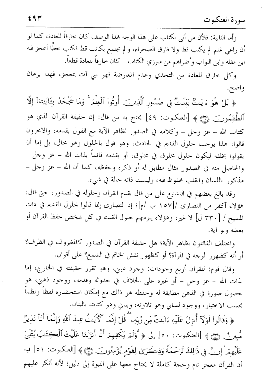 {بَلْ هُوَ آياتٌ بَيِّناتٌ فِي صُدُورِ الَّذِينَ أُوتُوا الْعِلْمَ وَما يَجْحَدُ بِآياتِنا إِلاَّ الظّالِمُونَ} (٤٩) [العنكبوت: ٤٩] يحتج به من قال: إن حقيقة القرآن الذي هو كتاب الله-عز وجل-وكلامه في الصدور لظاهر الآية مع القول بقدمه، والآخرون قالوا: هذا يوجب حلول القديم في الحادث، وهو قول بالحلول وهو محال، بل إما أن يقولوا بخلقه ليكون حلول مخلوق في مخلوق، أو بقدمه قائما بذات الله-عز وجل- والحاصل منه في الصدور مثال مطابق له أو ذكره وحفظه، كما أن الله-عز وجل- مذكور باللسان والقلب محفوظ فيه، وليست ذاته حالة في شيء.