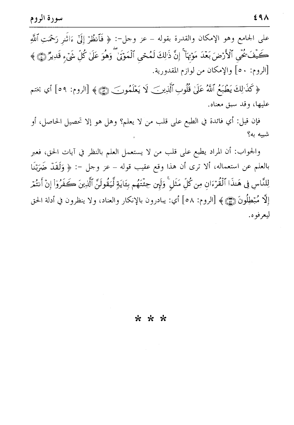 والجواب: أن المراد يطبع على قلب من لا يستعمل العلم بالنظر في آيات الحق، فعبر بالعلم عن استعماله، ألا ترى أن هذا وقع عقيب قوله-عز وجل-: {وَلَقَدْ ضَرَبْنا لِلنّاسِ فِي هذَا الْقُرْآنِ مِنْ كُلِّ مَثَلٍ وَلَئِنْ جِئْتَهُمْ بِآيَةٍ لَيَقُولَنَّ الَّذِينَ كَفَرُوا إِنْ أَنْتُمْ إِلاّ مُبْطِلُونَ} (٥٨) [الروم: ٥٨] أي: يبادرون بالإنكار والعناد، ولا ينظرون في أدلة الحق ليعرفوه.