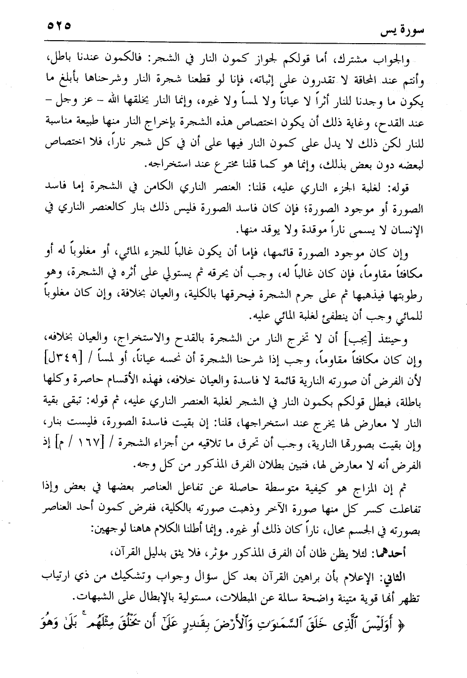 قوله: لغلبة الجزء الناري عليه، قلنا: العنصر الناري الكامن في الشجرة إما فاسد الصورة أو موجود الصورة؛ فإن كان فاسد الصورة فليس ذلك بنار كالعنصر الناري في الإنسان لا يسمى نارا موقدة ولا يوقد منها.