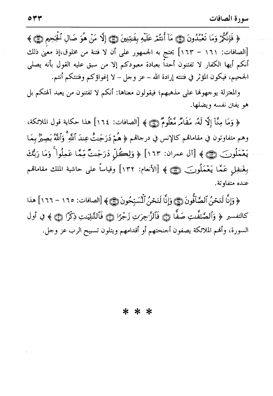 {وَإِنّا لَنَحْنُ الصَّافُّونَ (١٦٥) وَإِنّا لَنَحْنُ الْمُسَبِّحُونَ} (١٦٦) [الصافات: ١٦٥ - ١٦٦] هذا كالتفسير {وَالصَّافّاتِ صَفًّا (١) فَالزّاجِراتِ زَجْراً (٢) فَالتّالِياتِ ذِكْراً} (٣) في أول السورة، وأنهم الملائكة يصفون أجنحتهم أو أقدامهم ويتلون تسبيح الرب عز وجل.