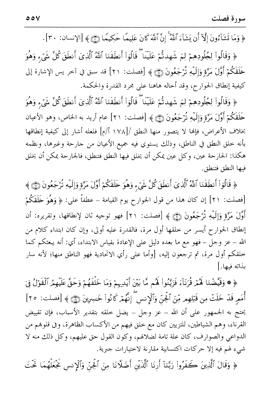 {وَقالُوا لِجُلُودِهِمْ لِمَ شَهِدْتُمْ عَلَيْنا قالُوا أَنْطَقَنَا اللهُ الَّذِي أَنْطَقَ كُلَّ شَيْءٍ وَهُوَ خَلَقَكُمْ أَوَّلَ مَرَّةٍ وَإِلَيْهِ تُرْجَعُونَ} (٢١) [فصلت: ٢١] قد سبق في آخر يس الإشارة إلى كيفية إنطاق الجوارح، وقد أحاله هاهنا على مجرد القدرة والحكمة.
