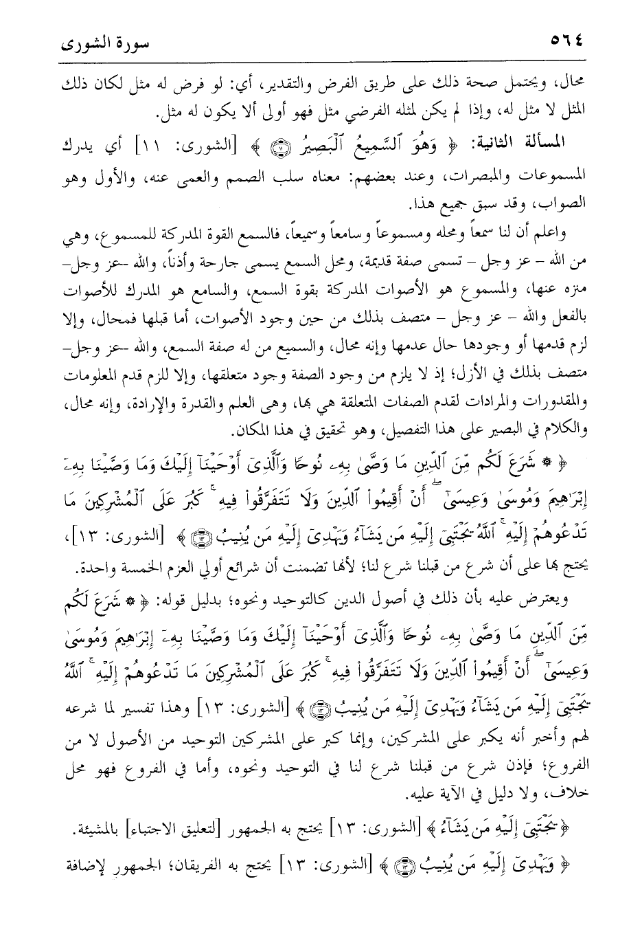 المسألة الثانية: {وَهُوَ السَّمِيعُ الْبَصِيرُ} (١١) [الشورى: ١١] أي يدرك المسموعات والمبصرات، وعند بعضهم: معناه سلب الصمم والعمى عنه، والأول وهو الصواب، وقد سبق جميع هذا.