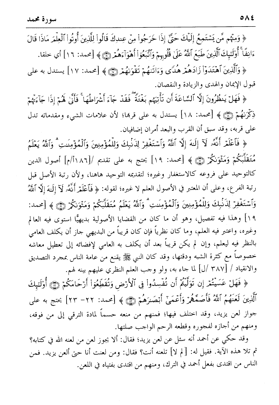 {فَهَلْ عَسَيْتُمْ إِنْ تَوَلَّيْتُمْ أَنْ تُفْسِدُوا فِي الْأَرْضِ وَتُقَطِّعُوا أَرْحامَكُمْ (٢٢) أُولئِكَ الَّذِينَ لَعَنَهُمُ اللهُ فَأَصَمَّهُمْ وَأَعْمى أَبْصارَهُمْ} (٢٣) [محمد: ٢٢ - ٢٣] يحتج به على جواز لعن يزيد، وقد اختلف فيها؛ فمنهم من منعه حسما لمادة الترقي إلى من فوقه، ومنهم من أجازه لفجوره وقطعه الرحم الواجب صلتها.