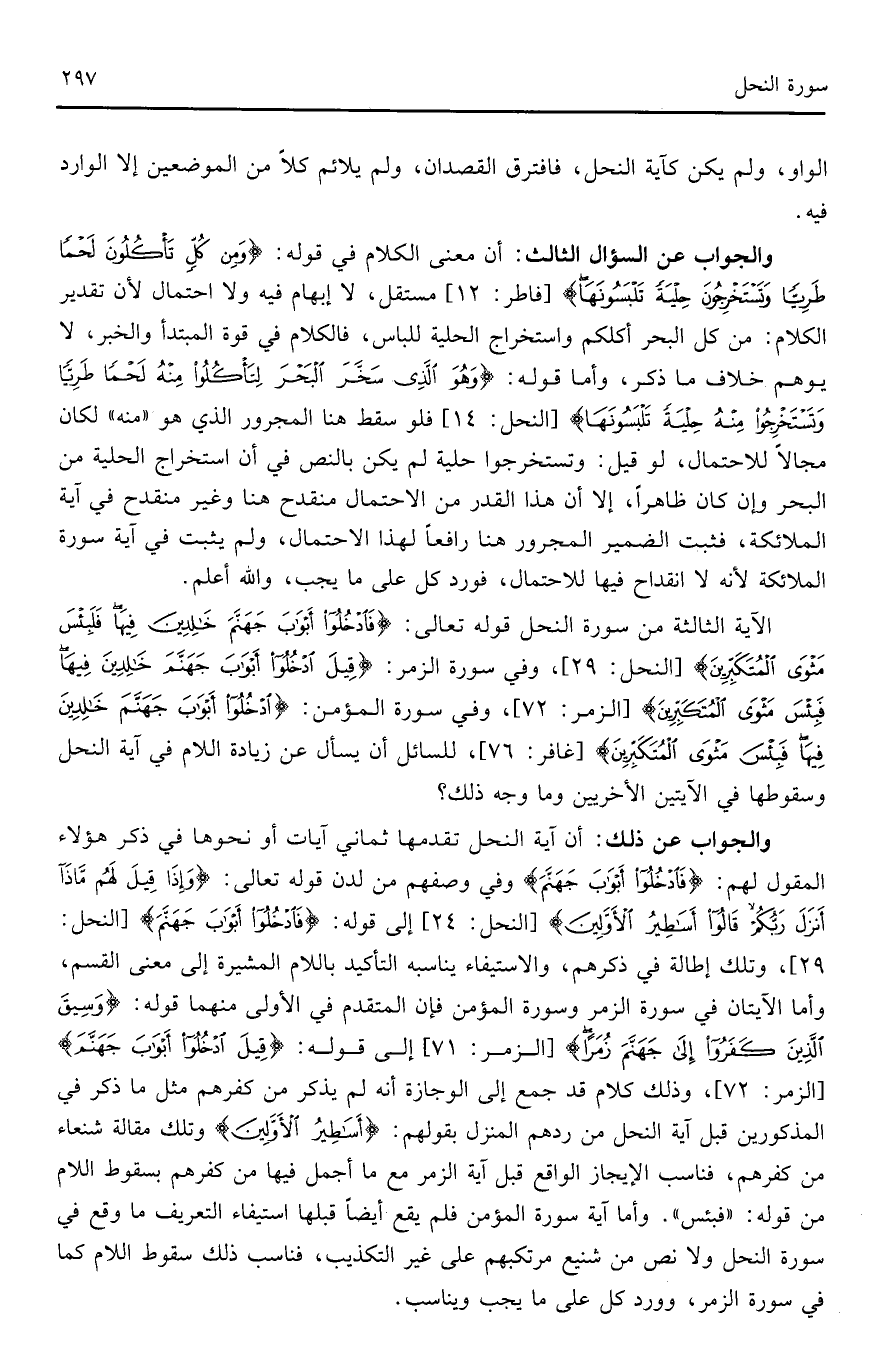 والجواب عن السؤال الثالث: أن معنى الكلام فى قوله (وَمِنْ كُلٍّ تَأْكُلُونَ لَحْمًا طَرِيًّا وَتَسْتَخْرِجُونَ حِلْيَةً تَلْبَسُونَهَا) (فاطر: 12) مستقل، لا ابهام فيه ولا احتمال لآن تقدير الكلام: من كل البحر أكلكم واستخراج الحلية للباس فالكلام فى قوة المبتأوالخبر، لايوهم خلاف ما ذكر، وأما قوله: (وَهُوَ الَّذِي سَخَّرَ الْبَحْرَ لِتَأْكُلُوا مِنْهُ لَحْمًا طَرِيًّا وَتَسْتَخْرِجُوا مِنْهُ حِلْيَةً تَلْبَسُونَهَا) (النحل: 14) فلو سقط هنا المجرور الذى هو ((منه)) لكان مجالا للاحتمال، لو قيل: وتستخرجوا حلية لم يكن بالنص فى أن استخراج الحلية من البحر وان كان ظاهرا الا أن هذا القدر من الاحتمال منقدح هنا وغير منقدح فى أية الملائكة لآنة لا انقداح فيها للاحتمال فورد كل على ما يجب، والله واعلم.