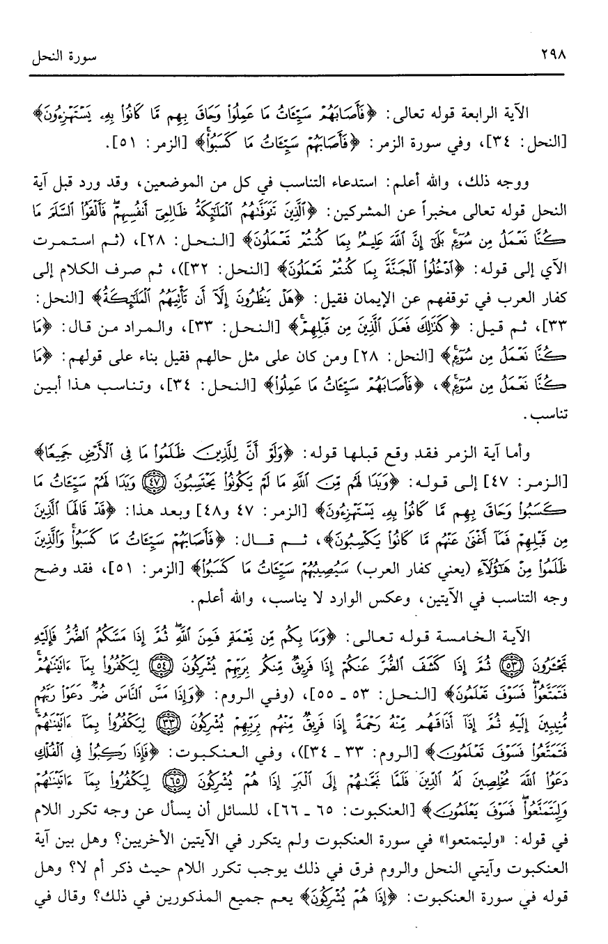 الآية الخامسة قوله تعالى: (وَمَا بِكُمْ مِنْ نِعْمَةٍ فَمِنَ اللَّهِ ثُمَّ إِذَا مَسَّكُمُ الضُّرُّ فَإِلَيْهِ تَجْأَرُونَ (53) ثُمَّ إِذَا كَشَفَ الضُّرَّ عَنْكُمْ إِذَا فَرِيقٌ مِنْكُمْ بِرَبِّهِمْ يُشْرِكُونَ (54) لِيَكْفُرُوا بِمَا آتَيْنَاهُمْ فَتَمَتَّعُوا فَسَوْفَ تَعْلَمُونَ) (النحل: 53 - 55)، (وفى الروم: (وَإِذَا مَسَّ النَّاسَ ضُرٌّ دَعَوْا رَبَّهُمْ مُنِيبِينَ إِلَيْهِ ثُمَّ إِذَا أَذَاقَهُمْ مِنْهُ رَحْمَةً إِذَا فَرِيقٌ مِنْهُمْ بِرَبِّهِمْ يُشْرِكُونَ (33) لِيَكْفُرُوا بِمَا آتَيْنَاهُمْ فَتَمَتَّعُوا فَسَوْفَ تَعْلَمُونَ) (النحل: 33 - 34))، وفى العنكبوت: (فَإِذَا رَكِبُوا فِي الْفُلْكِ دَعَوُا اللَّهَ مُخْلِصِينَ لَهُ الدِّينَ فَلَمَّا نَجَّاهُمْ إِلَى الْبَرِّ إِذَا هُمْ يُشْرِكُونَ (65) لِيَكْفُرُوا بِمَا آتَيْنَاهُمْ وَلِيَتَمَتَّعُوا فَسَوْفَ يَعْلَمُونَ) (العنكبوت65 - 66)، للسائل أن يسأل عن وجه تكرر اللام فى قوله: ((وليتمتعوا)) في سورة العنكبوت ولم يتكرر فى الآيتين الآخريين؟ وهل بين أية العنكبوت وأيتى النحل والروم فرق فى ذلك يوجب تكرار اللام حيث ذكر ام لا؟ وهل قوله فى سورة العنكبوت: (إِذَا هُمْ يُشْرِكُونَ) يعم جميع المذكورين فى ذلك؟ وقال فى