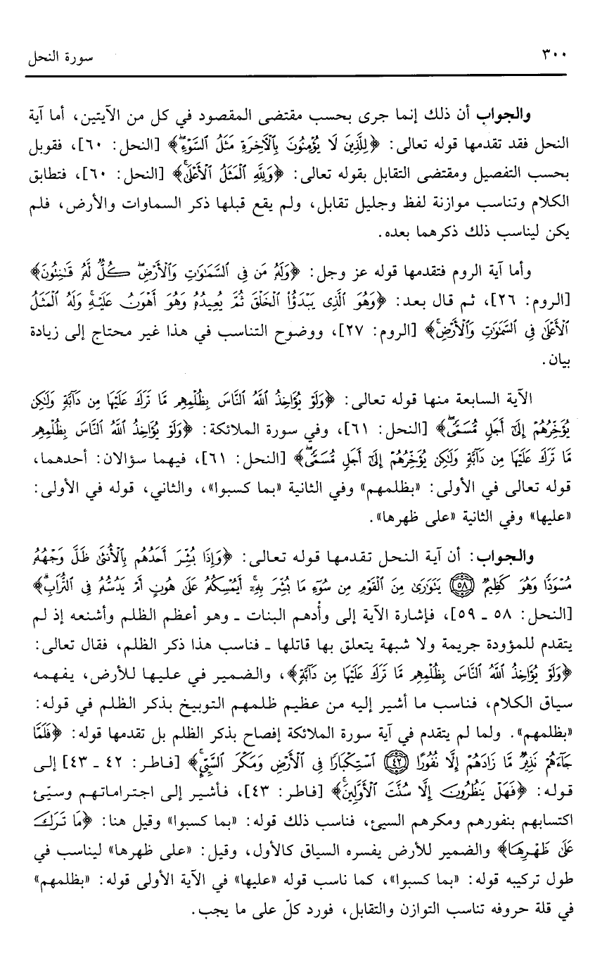 والجواب أن ذلك إنما جرى بحسب مقتضى المقصود في كل من الآيتين، أما آية النحل فقد تقدمها قوله تعالى: (لِلَّذِينَ لَا يُؤْمِنُونَ بِالْآخِرَةِ مَثَلُ السَّوْءِ) (النحل: 60)، فقوبل بحسب التفصيل ومقتضى التقابل بقوله تعالى: (وَلِلَّهِ الْمَثَلُ الْأَعْلَى) (النحل: 60)، فتطابق الكلام وتناسب موزانة لفظ وجليل تقابل، ولم يقع قلبها ذكر السماوات والأرض، فلم يكن ليناسب ذلك ذكرهما بعده.