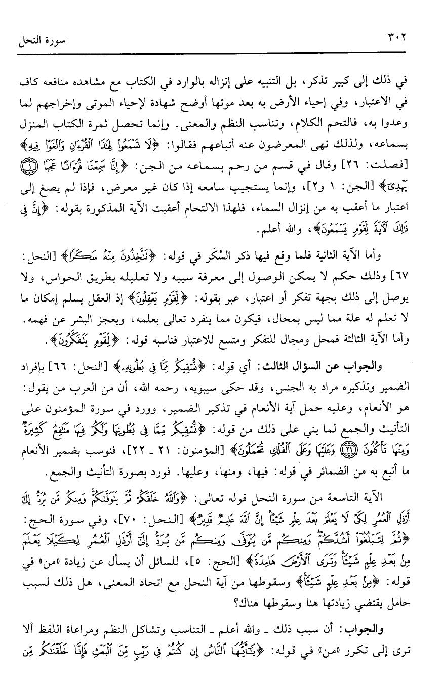 والجواب عن السؤال الثالث: أي قوله: (نُسْقِيكُمْ مِمَّا فِي بُطُونِهِ) (النحل: 66) بإفراد الضمير وتذكيره مراد به الجنس، وقد حكى سيبويه، رحمه الله، أن من العرب من يقول: هو الأنعام، وعليه حمل آية الأنعام في تذكير الضمير، وورد في سورة المؤمنون على التأنيث والجمع لما بني على ذلك من قوله: (نُسْقِيكُمْ مِمَّا فِي بُطُونِهَا وَلَكُمْ فِيهَا مَنَافِعُ كَثِيرَةٌ وَمِنْهَا تَأْكُلُونَ * وَعَلَيْهَا وَعَلَى الْفُلْكِ تُحْمَلُونَ) (المؤمنون: 21 - 22)، فنوسب بضمير الأنعام ما أتبع به من الضمائر في قوله: فيها، ومنها، وعليها. فورد بصورة التأنيث والجمع.
