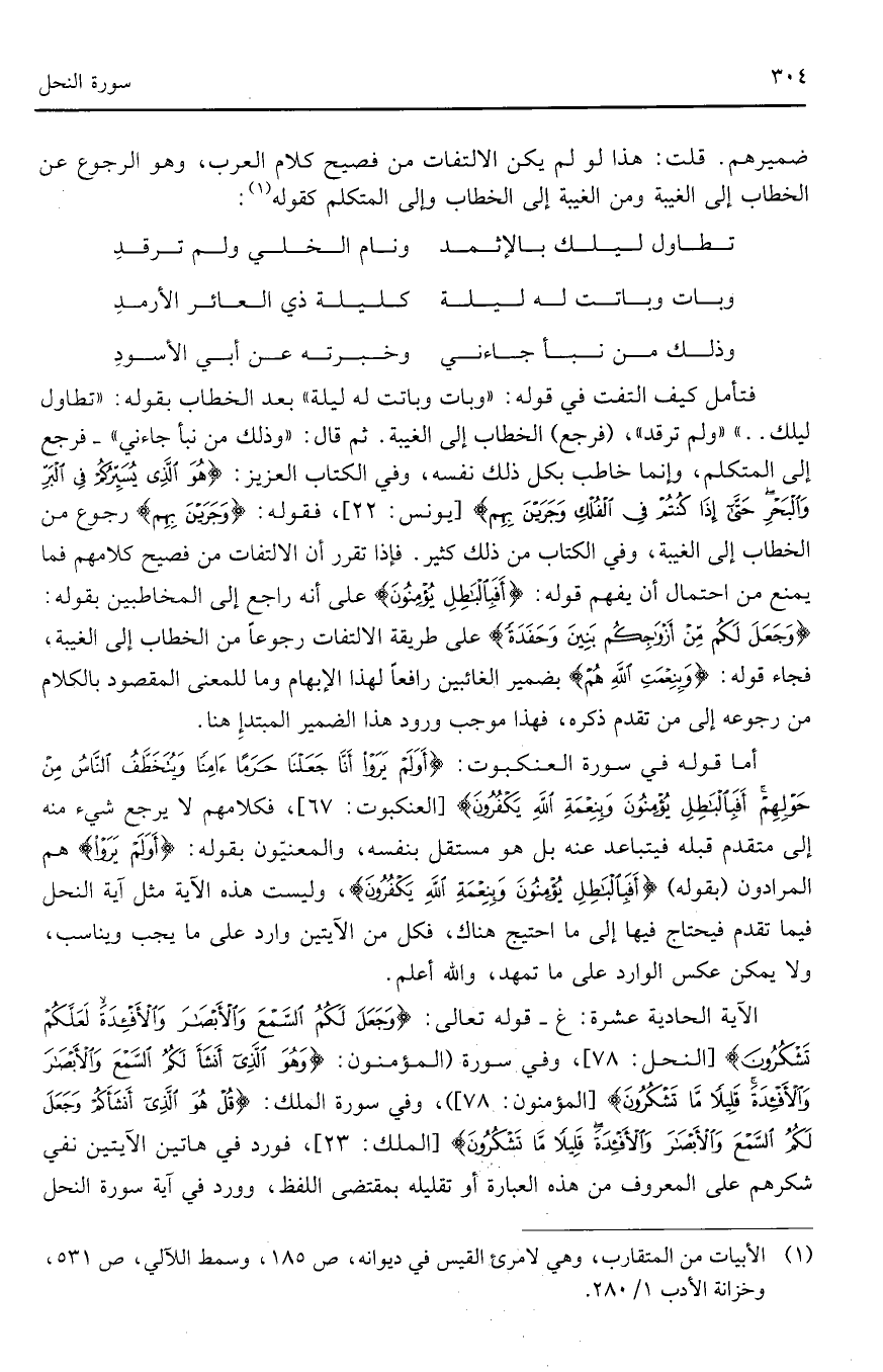 فتأمل كيف التفت في قوله: (وبات وباتت له ليلة)) بعد الخطاب بقوله: (تطاول ليلك .. ) ((ولم ترقد))، (فرجع) الخطاب إلى الغيبة. ثم قال: (وذلك من نبأ جاءني) - فرجع إلى المتكلم، وإنما خاطب بكل ذلك نفسه، وفي الكتاب العزيز (هُوَ الَّذِي يُسَيِّرُكُمْ فِي الْبَرِّ وَالْبَحْرِ حَتَّى إِذَا كُنْتُمْ فِي الْفُلْكِ وَجَرَيْنَ بِهِمْ) (يونس: 22)، فقوله: (وَجَرَيْنَ بِهِمْ) رجوع من الخطاب إلى الغيبة، وفي الكتاب من ذلك كثير. فإذا تقرر أن الالتفات من فصيح كلامهم فما يمنع من احتمال أن يفهم قوله: (أَفَبِالْبَاطِلِ يُؤْمِنُونَ) على أنه راجع إلى المخاطبين بقوله: (وَجَعَلَ لَكُمْ مِنْ أَزْوَاجِكُمْ بَنِينَ وَحَفَدَةً) على طريقة الالتفات رجوعاً من الخطاب إلى الغيبة، فجاء قوله: (وَبِنِعْمَتِ اللَّهِ هُمْ) بضمير الغائبين رافعاً لهذا الإبهام وما للمعنى المقصود بالكلام من رجوعه إلى من تقدم ذكره، فهذا موجب ورود هذا الضمير المبتدأ هنا.