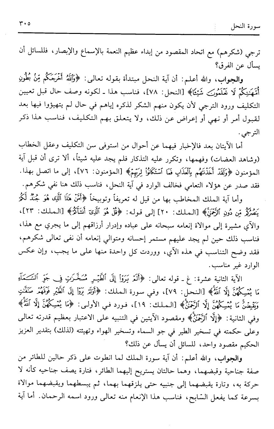 الآية الثانية عشرة: غ - قوله تعالى: (أَلَمْ يَرَوْا إِلَى الطَّيْرِ مُسَخَّرَاتٍ فِي جَوِّ السَّمَاءِ مَا يُمْسِكُهُنَّ إِلَّا اللَّهُ) (النحل: 79)، وفي سورة الملك: (أَوَلَمْ يَرَوْا إِلَى الطَّيْرِ فَوْقَهُمْ صَافَّاتٍ وَيَقْبِضْنَ مَا يُمْسِكُهُنَّ إِلَّا الرَّحْمَنُ) (الملك: 19)، فورد في الأولى: (مَا يُمْسِكُهُنَّ إِلَّا اللَّهُ) وفي الثانية: (إِلَّا الرَّحْمَنُ) ومقصود الآيتين في التنبيه على الاعتبار بعظيم قدرته تعالى وعلى حكمته في تسخير الطير في جو السماء وتسخير الهواء وتهيئة (لذلك) بتقدير العزيز الحكيم مقصود واحد، للسائل أن يسأل عن ذلك؟
