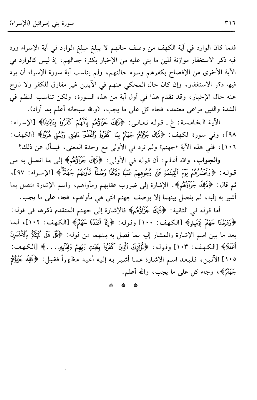الآية الخامسة: غ - قوله تعالى: (ذَلِكَ جَزَاؤُهُمْ بِأَنَّهُمْ كَفَرُوا بِآيَاتِنَا) (الإسراء: 98)، وفي سورة الكهف: (ذَلِكَ جَزَاؤُهُمْ جَهَنَّمُ بِمَا كَفَرُوا وَاتَّخَذُوا آيَاتِي وَرُسُلِي هُزُوًا) (الكهف: 106)، ففي هذه الآية (جهنم) ولم ترد في الأولى مع وحدة المعنى، فيسأل عن ذلك؟