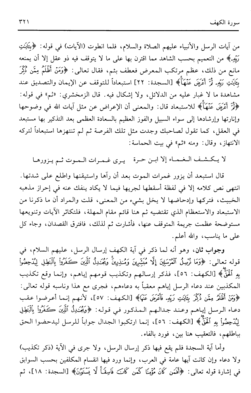 من آيات الرسل والأنبياء عليهم الصلاة والسلام، فلما انطوت (الآيات) في قوله: (بِآيَاتِ رَبِّهِ) من التعميم بحسب الشاهد مما اقترن بها على ما لا يتوقف فيه ذو عقل إلا أن يمنعه مانع من ذلك، عظم مرتكب المعرض فعطف بثم، قال تعالى: (وَمَنْ أَظْلَمُ مِمَّنْ ذُكِّرَ بِآيَاتِ رَبِّهِ ثُمَّ أَعْرَضَ عَنْهَا) (السجدة: 22) استبعاداً للتوقف عن الإيمان والتصديق عند مشاهدة ما لاغبار عليه من الدلائل، ولا إشكال فيه. قال الزمخشري: (ثم) في قوله: (ثُمَّ أَعْرَضَ عَنْهَا) للاستعباد قال: والمعنى أن الإعراض عن مثل آيات الله في وضوحها وإنارتها وإرشادها إلى سواء السبيل والفوز العظيم بالسعادة العظمى بعد التذكير بها مستبعد في العقل، كما تقول لصاحبك وجدت مثل تلك الفرصة ثم لم تنتهزها استبعاداً لتركه الانتهاز، وقال: ومنه (ثم) في بيت الحماسة: