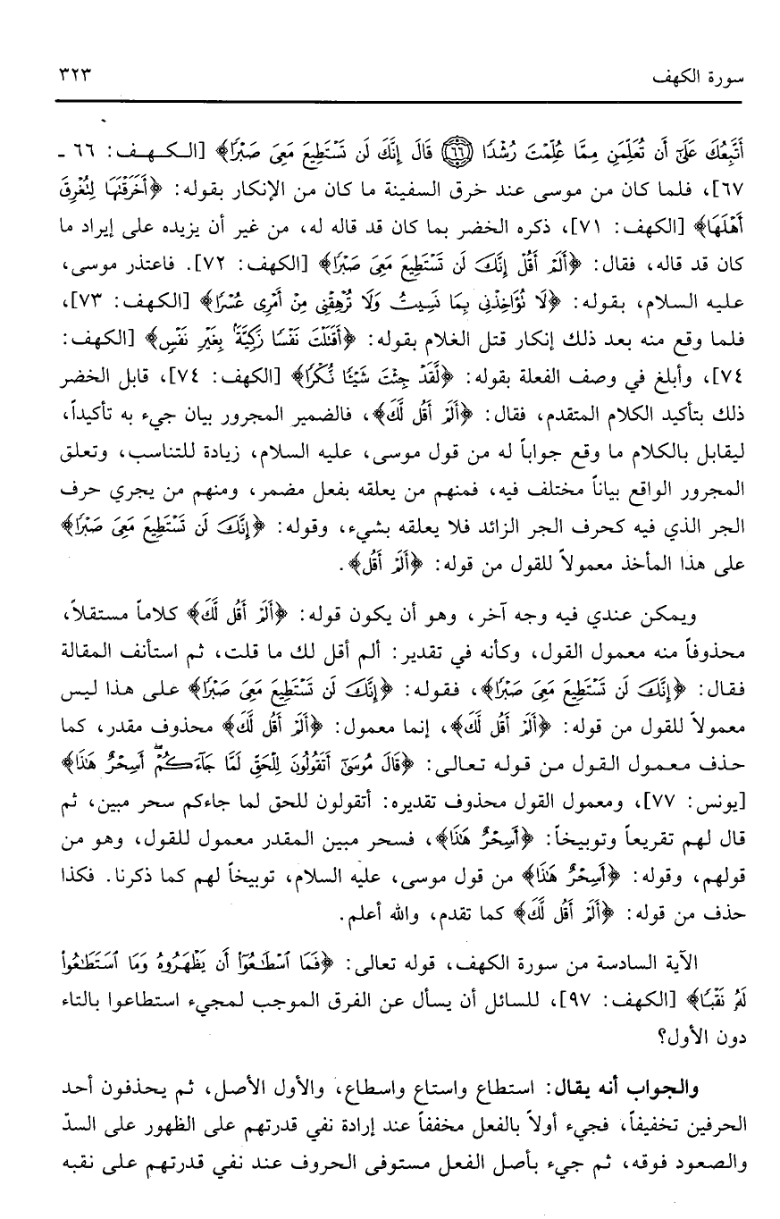 أَتَّبِعُكَ عَلَى أَنْ تُعَلِّمَنِ مِمَّا عُلِّمْتَ رُشْدًا * قَالَ إِنَّكَ لَنْ تَسْتَطِيعَ مَعِيَ صَبْرًا) (الكهف: 6 - 67) فلما كان من موسى عند خرق السفينة ما كان من الإنكار بقوله: (خَرَقَهَا قَالَ أَخَرَقْتَهَا لِتُغْرِقَ أَهْلَهَا لَقَدْ جِئْتَ شَيْئًا إِمْرًا) (الكهف: 71)، ذكره الخضر بما كان قد قاله له، من غير أن يزيده على إيراد ما كان قد قاله، فقال: (أَلَمْ أَقُلْ إِنَّكَ لَنْ تَسْتَطِيعَ مَعِيَ صَبْرًا) (الكهف: 72). فاعتذر موسى، عليه السلام، بقوله: (لَا تُؤَاخِذْنِي بِمَا نَسِيتُ وَلَا تُرْهِقْنِي مِنْ أَمْرِي عُسْرًا) (الكهف: 73)، فلما وقع منه بعد ذلك إنكار قتل الغلام بقوله: (أَقَتَلْتَ نَفْسًا زَكِيَّةً بِغَيْرِ نَفْسٍ) (الكهف: 74)، وأبلغ في وصف الفعلة بقوله: (لَقَدْ جِئْتَ شَيْئًا نُكْرًا) (الكهف: 74)، قابل الخضر ذلك بتأكيد الكلام المتقدم، فقال: (قَالَ أَلَمْ أَقُلْ لَكَ)، فالضمير المجرورة بيان جيء به تأكيداً، ليقابل بالكلام ما وقع جواباً له من قوله موسى، عليه السلام، زيادة للتناسسب، وتعلق المجرور الواقع بياناً مختلف فيه، فمنهم من يعلقه بفعل مضمر، ومنهم من يجري حرف الجر الذي فيه كحرف الجر الزائد فلا يعلقه بشيء، وقوله: (إِنَّكَ لَنْ تَسْتَطِيعَ مَعِيَ صَبْرًا) على هذا لامأذخ معمولاً للقول من قوله: (أَلَمْ أَقُلْ).