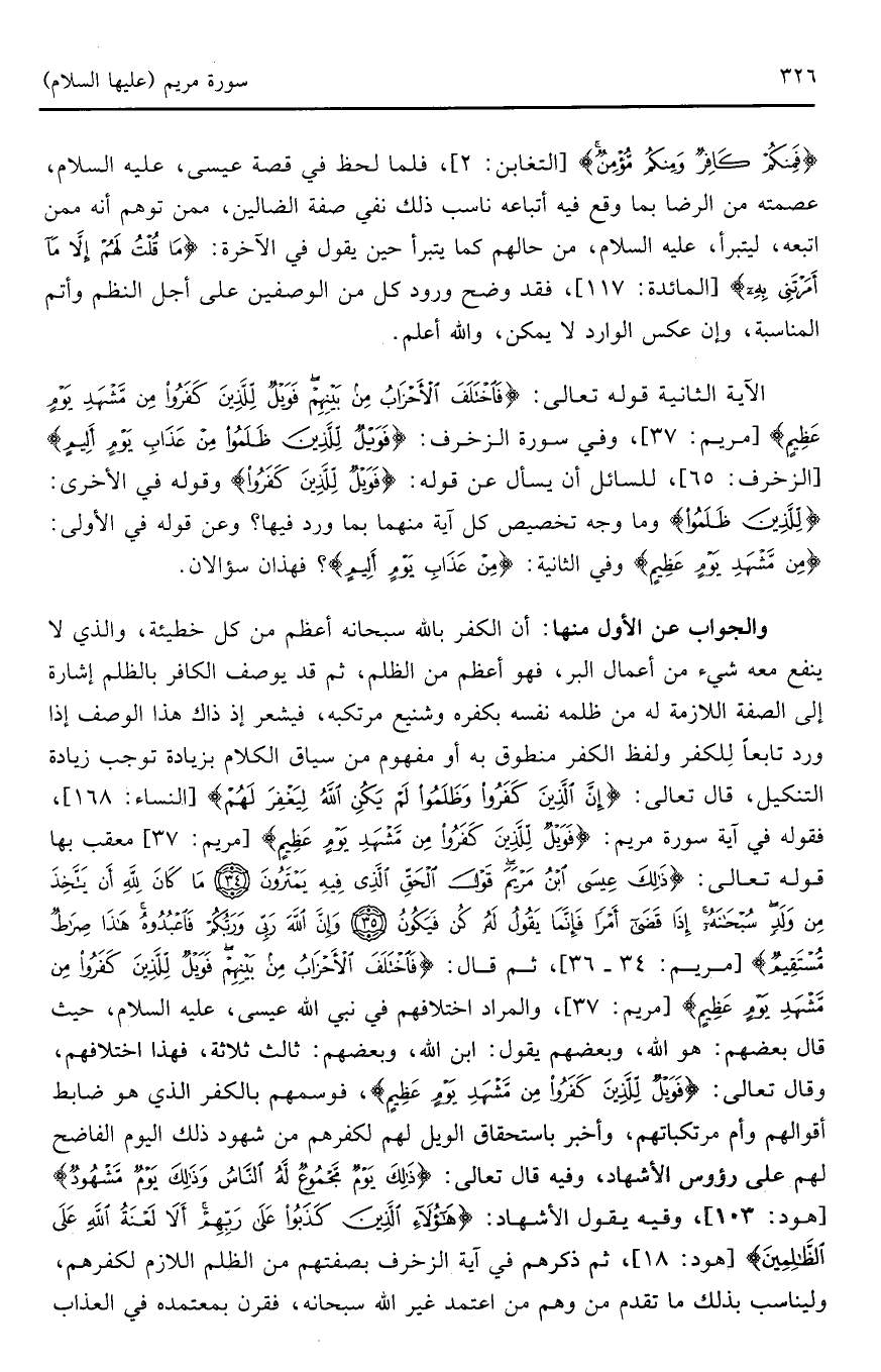 والجواب عن الأول منها: أن الكفر بالله سبحانه أعظم من كل خطيئة، والذي لا ينفع معه شيء من أعمال البر، فهو أعظم من الظلم، ثم قد يوصف الكافر بالظلم إشارة إلى الصفة اللازمة له من ظلمه نفسه بكفره وشنيع مرتكبه، فيشعر إذ ذاك هذا الوصف إذا ورد تابعاً للكفر ولفظ الكفر منطوق به أو مفهوم من سياق الكلام بزيادة توجب زيادة التنكيل، قال تعالى: (إِنَّ الَّذِينَ كَفَرُوا وَظَلَمُوا لَمْ يَكُنِ اللَّهُ لِيَغْفِرَ لَهُمْ) (النساء: 168)، فقوله في آية سورة مريم: (فَوَيْلٌ لِلَّذِينَ كَفَرُوا مِنْ مَشْهَدِ يَوْمٍ عَظِيمٍ) (مريم: 37) معقب بها قوله تعالى: (ذَلِكَ عِيسَى ابْنُ مَرْيَمَ قَوْلَ الْحَقِّ الَّذِي فِيهِ يَمْتَرُونَ * مَا كَانَ لِلَّهِ أَنْ يَتَّخِذَ مِنْ وَلَدٍ سُبْحَانَهُ إِذَا قَضَى أَمْرًا فَإِنَّمَا يَقُولُ لَهُ كُنْ فَيَكُونُ * وَإِنَّ اللَّهَ رَبِّي وَرَبُّكُمْ فَاعْبُدُوهُ هَذَا صِرَاطٌ مُسْتَقِيمٌ) (مريم: 34 - 36)، ثم قال: (فَاخْتَلَفَ الْأَحْزَابُ مِنْ بَيْنِهِمْ فَوَيْلٌ لِلَّذِينَ كَفَرُوا مِنْ مَشْهَدِ يَوْمٍ عَظِيمٍ) (مريم: 37)، والمراد اختلافهم في نبي الله عيسى، عليه السلام، حيث قال بعضهم: هو الله، وبعضهم يقول: ابن الله، وبعضهم: ثالث ثلاثه، فهذا اختلافهم، وقال تعالى: (فَوَيْلٌ لِلَّذِينَ كَفَرُوا مِنْ مَشْهَدِ يَوْمٍ عَظِيمٍ)، فومهم بالكفر الذي هو ضابط أقوالهم وأم مرتكباتهم، وأخبر باستحقاق الويل لهم لكفرهم من شهود ذلك اليوم الفاضح لهم على رؤوس الأشهاد، وفيه قال تعالى: (ذَلِكَ يَوْمٌ مَجْمُوعٌ لَهُ النَّاسُ وَذَلِكَ يَوْمٌ مَشْهُودٌ) (هود: 103)، وفيه يقول الأشهاد: (هَؤُلَاءِ الَّذِينَ كَذَبُوا عَلَى رَبِّهِمْ أَلَا لَعْنَةُ اللَّهِ عَلَى الظَّالِمِينَ) (هود: 18)، ثم ذكرهم في آية الزخرف بصفتهم من الظلم اللازم لكفرهم، وليناسب بذلك ما تقدم من وهم من أعتمد غير الله سبحانه، فقرن بمعتمده في العذاب