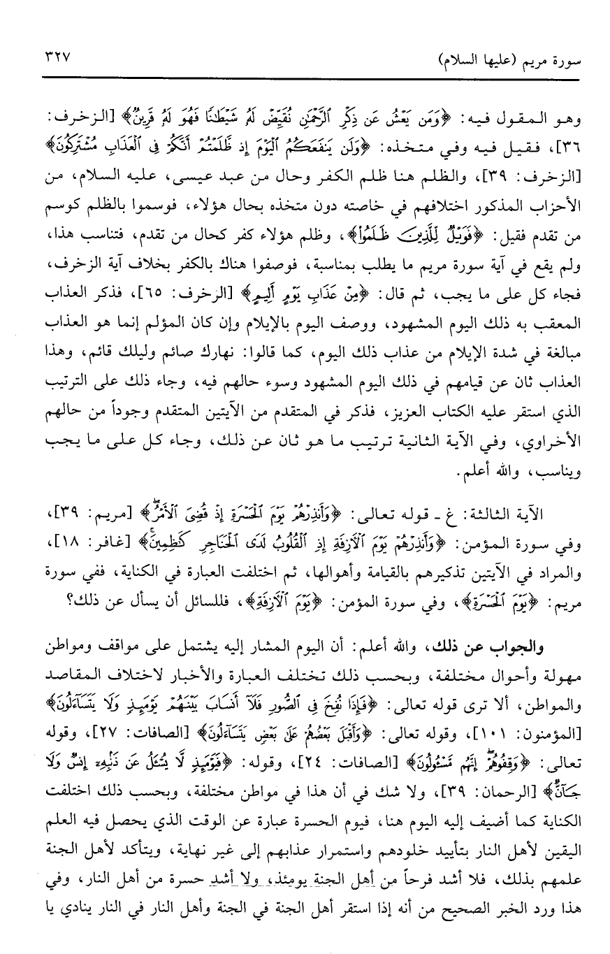 والجواب عن ذلك، والله أعلم: أن اليوم المشار إليه يشتمل على موقف ومواطن مهولة وأحوال مختلفة، وبحسب ذلك تختلف العبارة والأخبار لاختلاف المقاصد والمواطن، ألا ترى قوله تعالى (فَإِذَا نُفِخَ فِي الصُّورِ فَلَا أَنْسَابَ بَيْنَهُمْ يَوْمَئِذٍ وَلَا يَتَسَاءَلُونَ) (المؤمنون: 101)، وقوله تعالى: (وَأَقْبَلَ بَعْضُهُمْ عَلَى بَعْضٍ يَتَسَاءَلُونَ) (الصافات: 27)، وقوله تعالى: (وَقِفُوهُمْ إِنَّهُمْ مَسْئُولُونَ) (الصافات: 24)، وقوله: (فَيَوْمَئِذٍ لَا يُسْأَلُ عَنْ ذَنْبِهِ إِنْسٌ وَلَا جَانٌّ) (الرحمن: 39)، ولا شك في أن هذا في مواططن مختلفة، وبحسب ذلك اختلفت الكناية كما أضيف إليه اليوم هنا، فيوم الحسرة عبارة عن الوقت الذي يحصل فيه العلم اليقين لأهل النار بتأييد خلودهم واستمرار عذابهم إلى غير نهاية، ويتأكد لأهل الجنة علمهم بذلك، فلا أشد فرحاً من أهل الجنة يومئذ، ولا أشد حسرة من أهل النار، وفي هذا ورد الخبر الصحيح من أنه إذا استقر أهل الجنة في الجنة وأهل النار في النار ينادي يا