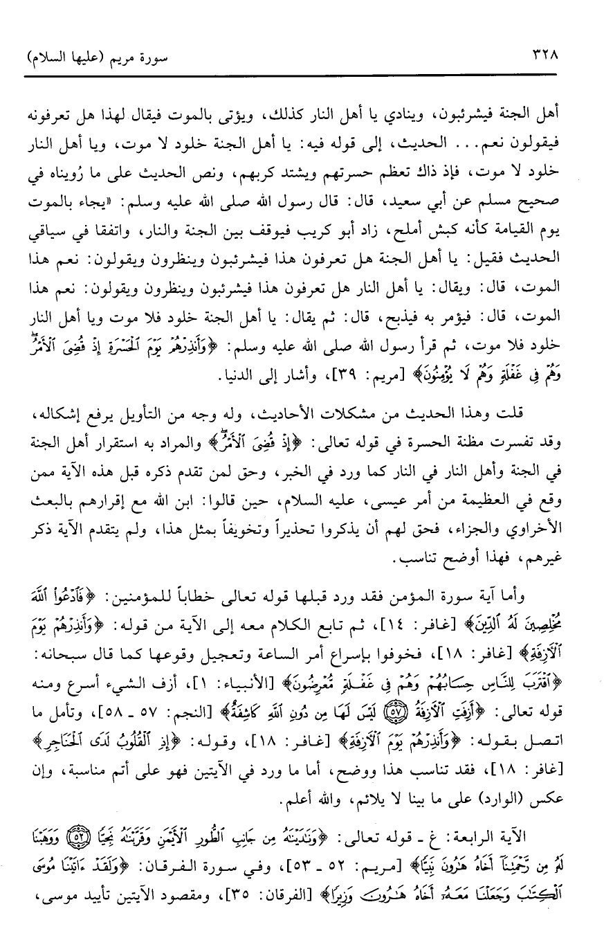 قلت وهذا الحديث من مشكلات الأحاديث، وله وجه من التأويل يرفع إشكاله، وقد تفسرت مظنة الحسرة في قوله تعالى: (إِذْ قُضِيَ الْأَمْرُ) والمراد به استقرار أهل الجنة في الجنة وأهل النار في النار كما ورد في الخبر، وحق لمن تقدم ذكره قبل هذه الآية ممن وقع في العظيمة من أمر عيسى، عليه السلام، حين قالوا: ابن الله مع إقرارهم بالبعث الأخراوي والجزاء، فحق لهم أن يذكروا تحذيراً وتخويفاً بمثل هذا، ولم يتقدم الآية ذكر غيرهم، فهذا أوض تناسب.