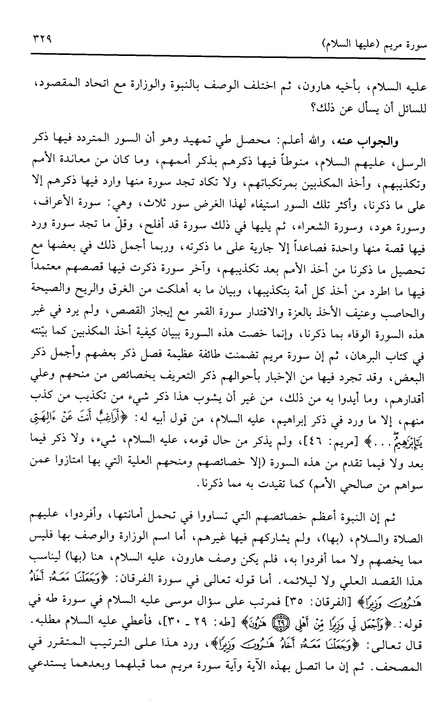 ثم إن النبوة أعظم خصائصهم التي تساووا في تحمل أمانتها، وأفردوا، عليهم الصلاة والسلام، (بها)، ولم يشاركهم فيها غيرهم، أما اسم الوزارة والوصف بها فليس مما يخصهم ولا مما أفردوا به، فلم يكن وصف هارون، عليه السلام، هنا (بها) ليناسب هذا القصد العلي ولا ليلائمه. وأما قوله تعالى في سورة الفرقان: (وَجَعَلْنَا مَعَهُ أَخَاهُ هَارُونَ وَزِيرًا) (الفرقان: 35) فمرتب على سؤال موسى عليه السلام في سورة طه في قوله: (وَاجْعَلْ لِي وَزِيرًا مِنْ أَهْلِي * هَارُونَ) (طه: 29 - 30)، فأعطى عليه السلام مطلبه. قال تعالى: (وَجَعَلْنَا مَعَهُ أَخَاهُ هَارُونَ وَزِيرًا)، ورد هذا على الترتيب المتقرر في المصحف. ثم إن ما اتصل بهذه الآية وآية سورة مريم مما قبلهما وبعدهما يستدعي