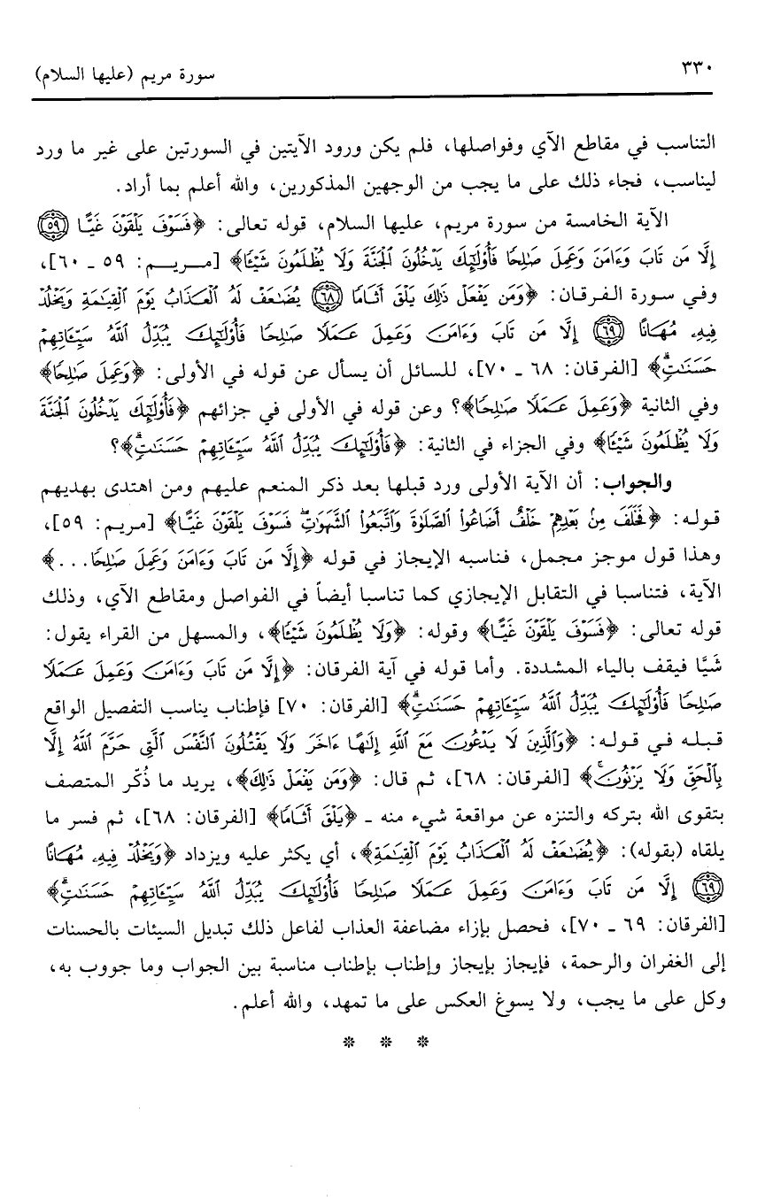 الآية الخامسة من سورة مريم، عليها السلام، قوله تعالى: (فَسَوْفَ يَلْقَوْنَ غَيًّا * إِلَّا مَنْ تَابَ وَآمَنَ وَعَمِلَ صَالِحًا فَأُولَئِكَ يَدْخُلُونَ الْجَنَّةَ وَلَا يُظْلَمُونَ شَيْئًا) (مريم: 59 - 60)، وفي سورة الفرقان: (وَالَّذِينَ لَا يَدْعُونَ مَعَ اللَّهِ إِلَهًا آخَرَ وَلَا يَقْتُلُونَ النَّفْسَ الَّتِي حَرَّمَ اللَّهُ إِلَّا بِالْحَقِّ وَلَا يَزْنُونَ وَمَنْ يَفْعَلْ ذَلِكَ يَلْقَ أَثَامًا (68) يُضَاعَفْ لَهُ الْعَذَابُ يَوْمَ الْقِيَامَةِ وَيَخْلُدْ فِيهِ مُهَانًا (69) إِلَّا مَنْ تَابَ وَآمَنَ وَعَمِلَ عَمَلًا صَالِحًا فَأُولَئِكَ يُبَدِّلُ اللَّهُ سَيِّئَاتِهِمْ حَسَنَاتٍ) (الفرقان: 68 - 70)، للسائل أن يسأل عن قوله في الأولى: (وَعَمِلَ صَالِحًا) وفي الثانية (وَعَمِلَ عَمَلًا صَالِحًا)؟ وعن قوله في الأولى في جزائهم (فَأُولَئِكَ يَدْخُلُونَ الْجَنَّةَ وَلَا يُظْلَمُونَ شَيْئًا) (وفي الجزاء في الثانية: (فَأُولَئِكَ يُبَدِّلُ اللَّهُ سَيِّئَاتِهِمْ حَسَنَاتٍ)؟
