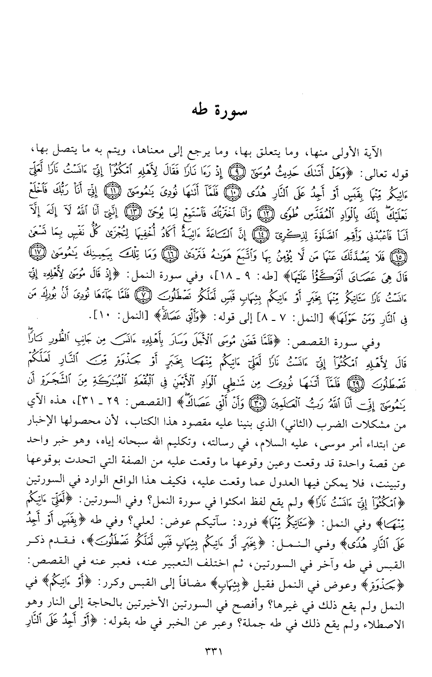 الآية الأولى منها، وما يتعلق بها، وما يرجع إلى معناها، ويتم به ما يتصل بها، قوله تعالى: (وَهَلْ أَتَاكَ حَدِيثُ مُوسَى * إِذْ رَأَى نَارًا فَقَالَ لِأَهْلِهِ امْكُثُوا إِنِّي آنَسْتُ نَارًا لَعَلِّي آتِيكُمْ مِنْهَا بِقَبَسٍ أَوْ أَجِدُ عَلَى النَّارِ هُدًى * فَلَمَّا أَتَاهَا نُودِيَ يَا مُوسَى * إِنِّي أَنَا رَبُّكَ فَاخْلَعْ نَعْلَيْكَ إِنَّكَ بِالْوَادِ الْمُقَدَّسِ طُوًى * وَأَنَا اخْتَرْتُكَ فَاسْتَمِعْ لِمَا يُوحَى * إِنَّنِي أَنَا اللَّهُ لَا إِلَهَ إِلَّا أَنَا فَاعْبُدْنِي وَأَقِمِ الصَّلَاةَ لِذِكْرِي * إِنَّ السَّاعَةَ آتِيَةٌ أَكَادُ أُخْفِيهَا لِتُجْزَى كُلُّ نَفْسٍ بِمَا تَسْعَى * فَلَا يَصُدَّنَّكَ عَنْهَا مَنْ لَا يُؤْمِنُ بِهَا وَاتَّبَعَ هَوَاهُ فَتَرْدَى * وَمَا تِلْكَ بِيَمِينِكَ يَا مُوسَى * قَالَ هِيَ عَصَايَ أَتَوَكَّأُ عَلَيْهَا وَأَهُشُّ بِهَا عَلَى غَنَمِي وَلِيَ فِيهَا مَآرِبُ أُخْرَى) (طه: 9 - 18)، وفي سورة النمل: (إِذْ قَالَ مُوسَى لِأَهْلِهِ إِنِّي آنَسْتُ نَارًا سَآتِيكُمْ مِنْهَا بِخَبَرٍ أَوْ آتِيكُمْ بِشِهَابٍ قَبَسٍ لَعَلَّكُمْ تَصْطَلُونَ * فَلَمَّا جَاءَهَا نُودِيَ أَنْ بُورِكَ مَنْ فِي النَّارِ وَمَنْ حَوْلَهَا) (النمل: 7 - 8) إلى قوله: (وَأَلْقِ عَصَاكَ) (النمل: 10).