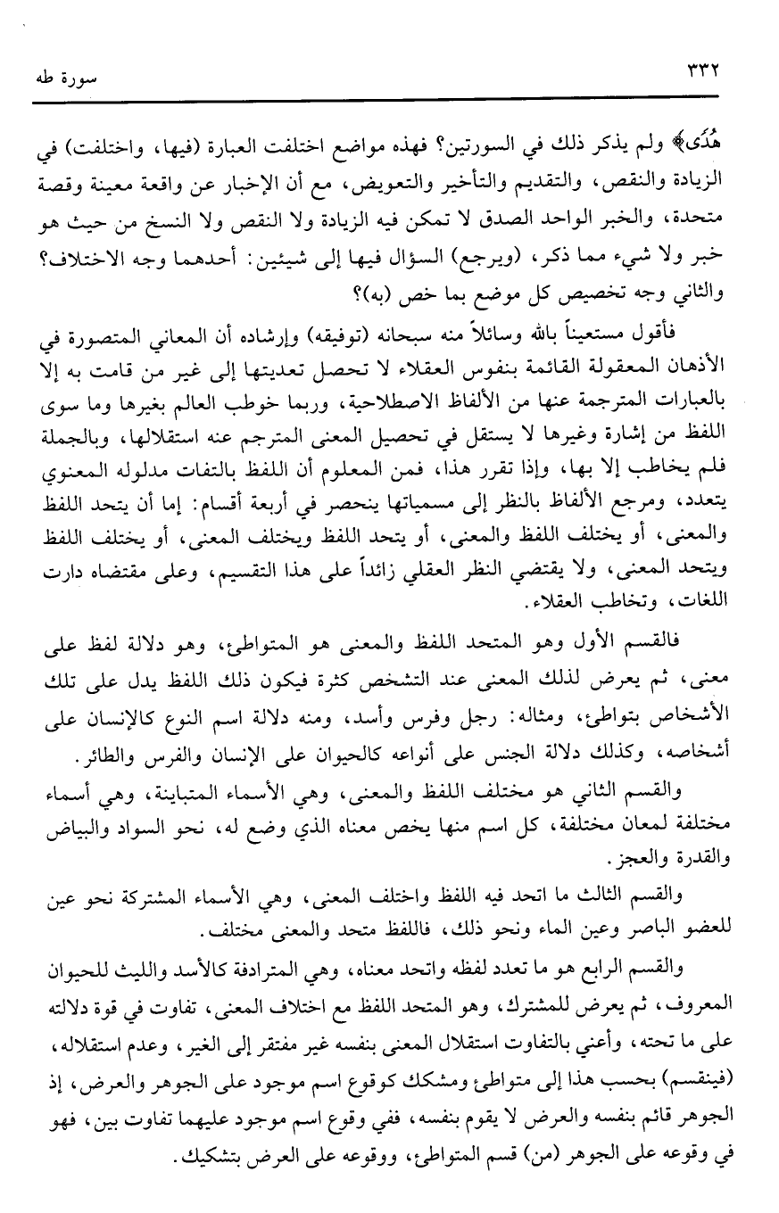 والقسم الرابع هو ما تعدد لفظه واتحد معناه، وهي المترادفة كالأسد والليث للحيوان المعروف، ثم يعرض للمشترك، وهو المتحد اللفظ مع اختلاف المعنى، تفاوت في قوة دلالته على ما تحته، وأعني بالتفاوت استقلال المعنى بنفسه غير مفتقر إلى الغير، وعدم استقلاله، (فينقسم) بحسب هذا إلأى متواطئ ومشكك كوقوع اسم موجود عليهما تفاوت بين، فهو في وقوعه على الجوهر (من) قسم المتواطئ، ووقوعه على العرض بتشكيك.