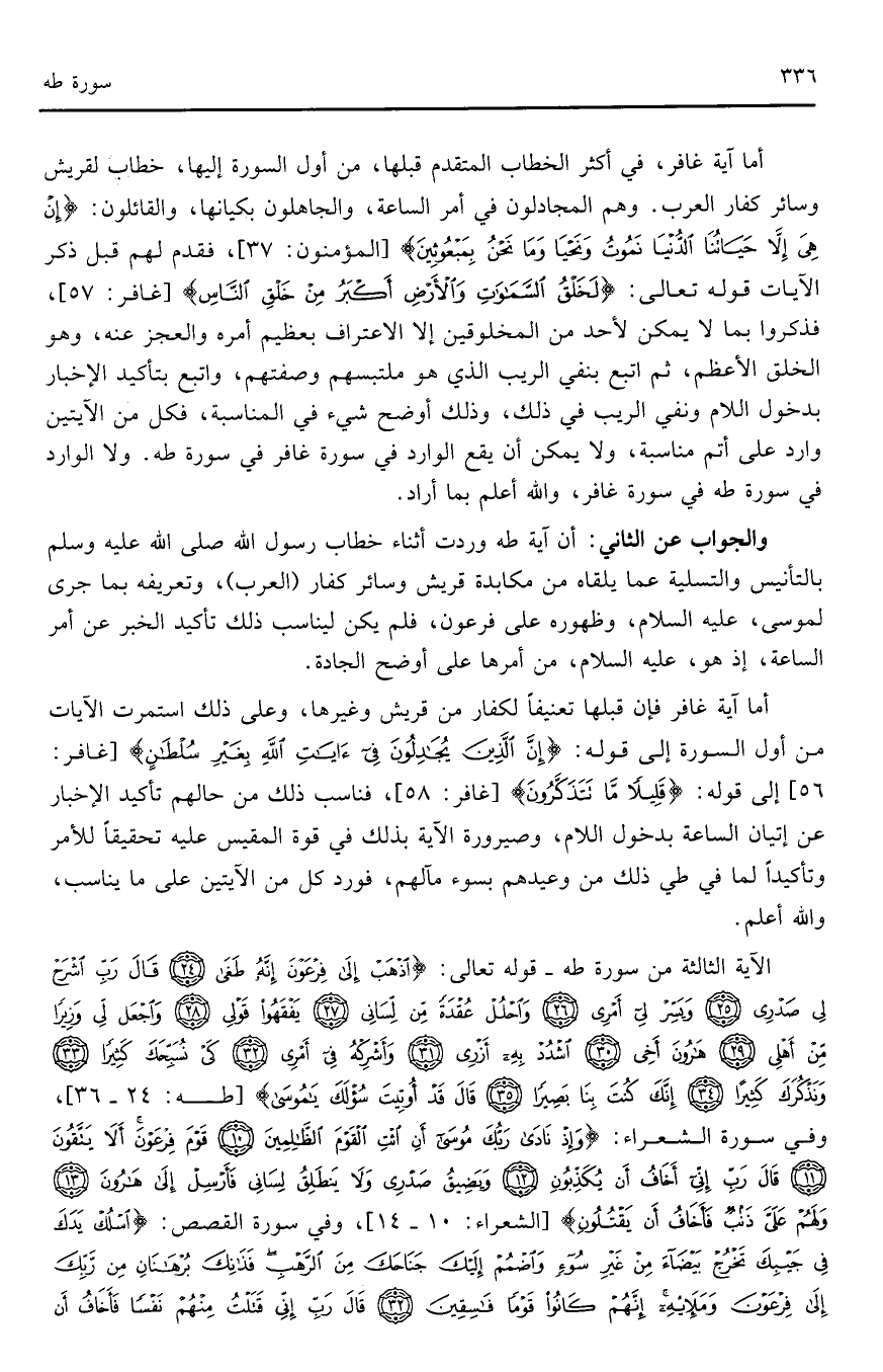 والجواب عن الثاني: أن آية طه وردت أثناء خطاب رسول الله صلى الله عليه وسلم بالتأنيس والتسلية عما يلقاه من مكابدة قريش وسائر كفار (العرب)، وتعريفه بما جرى لموسى، عليه السلام، وظهوره على فرعون، فلم يكن ليناسب ذلك تأكيد الخبر عن أمر الساعة، إذ هو، عليه السلام، من أمرها على أوضح الجادة.