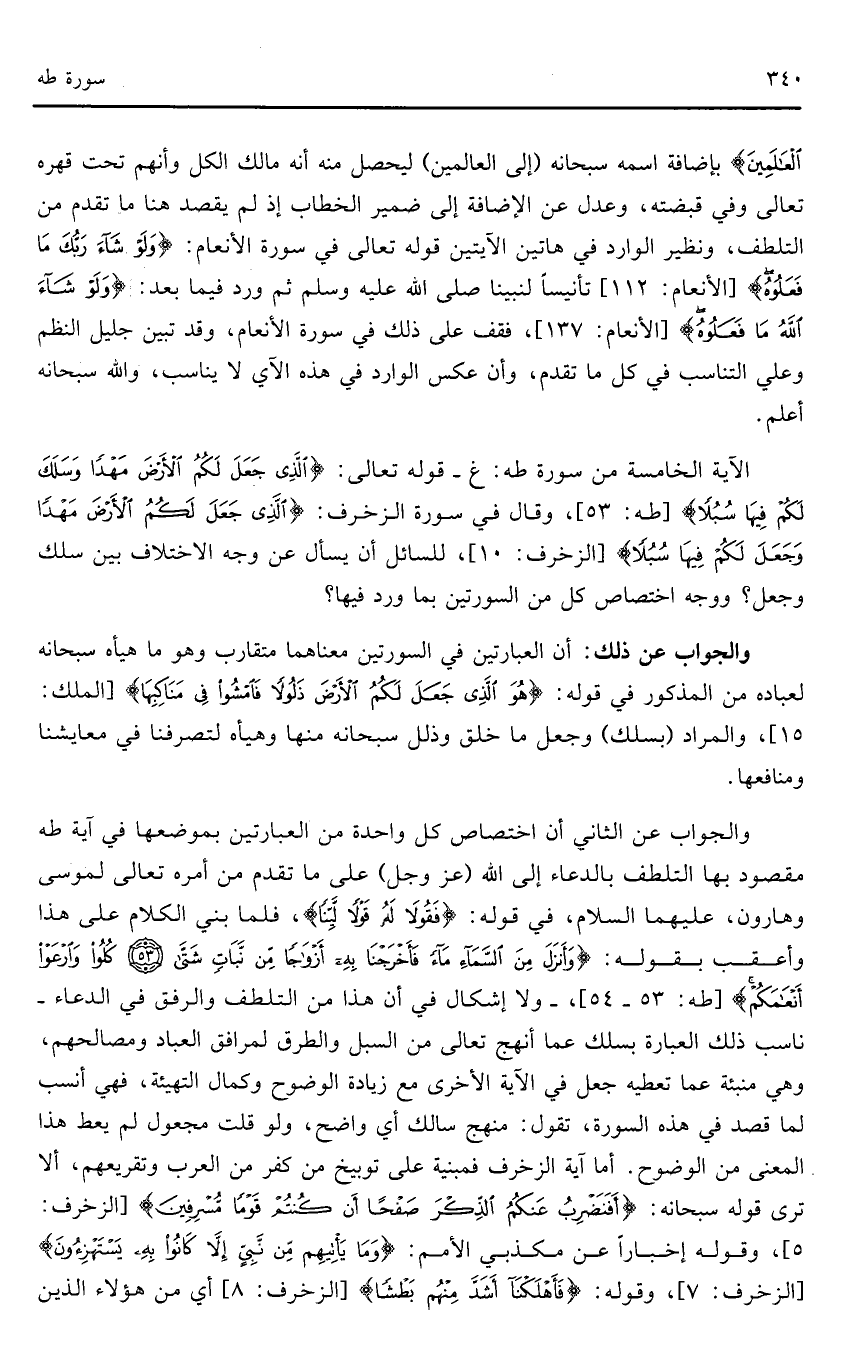 والجواب عن الثاني أن اختصاص كل واحدة من العبارتين بموضعها في آية طه مقصود بها التلطف بالدعاء إلى الله (عز وجل) على ما تقدم من أمره تعالى لموسى وهارون، عليهما السلام، في قوله: ((فَقُولَا لَهُ قَوْلًا لَيِّنًا) (طه: 44)، فلما بني الكلام على هذا وأعقب بقوله: (وَأَنْزَلَ مِنَ السَّمَاءِ مَاءً فَأَخْرَجْنَا بِهِ أَزْوَاجًا مِنْ نَبَاتٍ شَتَّى * كُلُوا وَارْعَوْا أَنْعَامَكُمْ) (طه: 53 - 54)، - ولا إشكال في أن هذا من التلطف والرفق في الدعاء - ناسب ذلك العبارة بسلك عما أنهج تعالى من السبل ولاطرق لمرافق العباد ومصالحهم، وهي منبئة عما تعطيه جعل في الآية الأخرى مع زيادة الوضوح وكمال التهيئة، فهي أنسب لما قصد في هذه السورة، تقول: منهج سالك أي واضح، ولو قلت مجعول لم يعط هذا المعنى من الوضوح. أما آية الزخرف فمبنية على توبيخ من كفر من العرب وترقيعهم، ألا ترى قوله سبحانه: (أَفَنَضْرِبُ عَنْكُمُ الذِّكْرَ صَفْحًا أَنْ كُنْتُمْ قَوْمًا مُسْرِفِينَ) (الزخرف: 5)، وقوله إخباراً عن مكذبي الأمم: (وَمَا يَأْتِيهِمْ مِنْ نَبِيٍّ إِلَّا كَانُوا بِهِ يَسْتَهْزِئُونَ) (الزخرف: 7)، وقوله: (فَأَهْلَكْنَا أَشَدَّ مِنْهُمْ بَطْشًا) (الزخرف: 8) أي من هؤلاء الذين