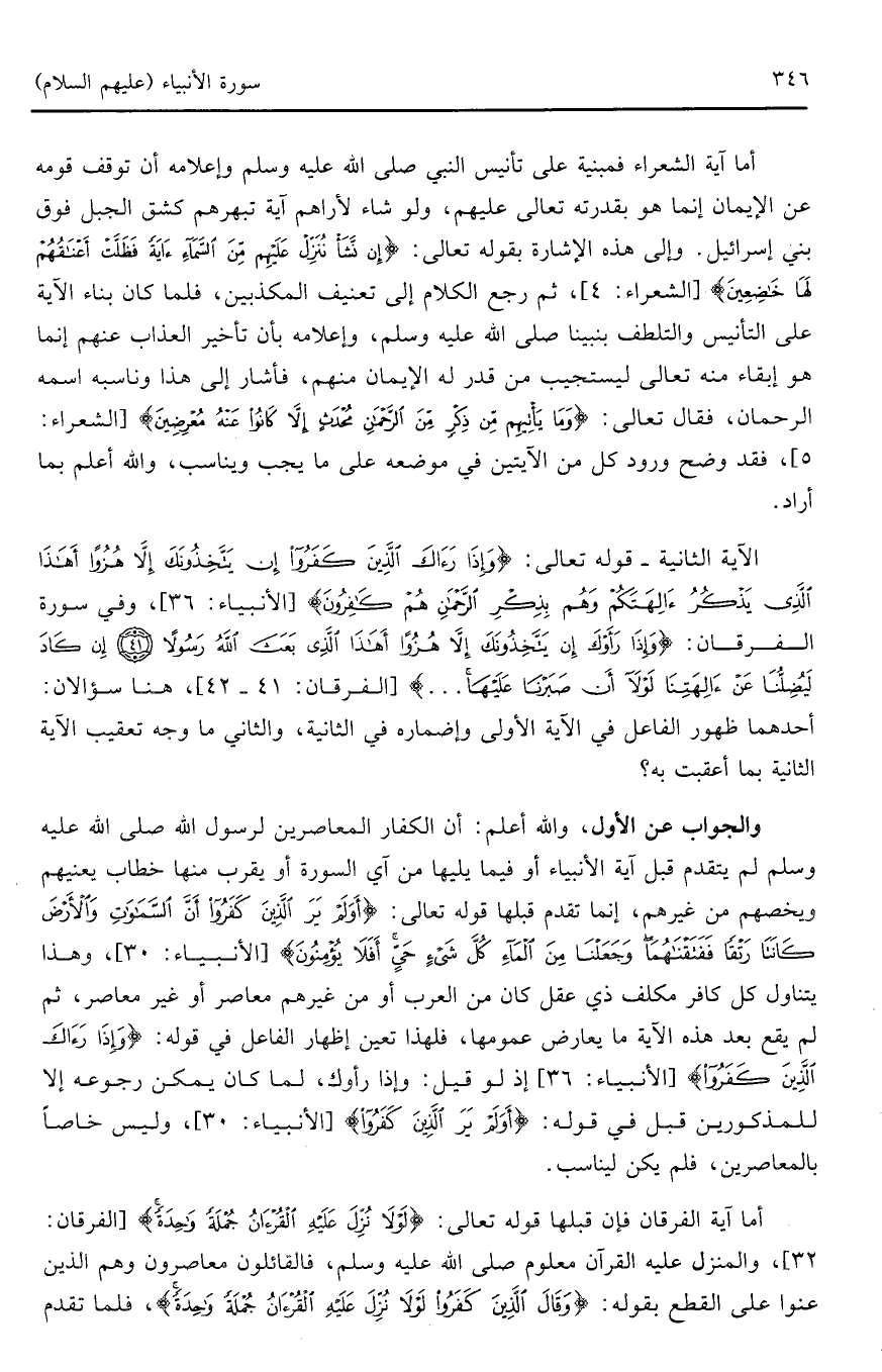 والجواب عن الأول، والله أعلم: أن الكفار المعاصرين لرسول الله صلى الله عليه وسلم لم يتقدم قبل آية الأنبياء أو فيما يليها من آي السورة أو يقرب منها خطاب يعنيهم ويخصهم من غيرهم، إنما تقدم قبلها قوله تعالى: (أَوَلَمْ يَرَ الَّذِينَ كَفَرُوا أَنَّ السَّمَاوَاتِ وَالْأَرْضَ كَانَتَا رَتْقًا فَفَتَقْنَاهُمَا وَجَعَلْنَا مِنَ الْمَاءِ كُلَّ شَيْءٍ حَيٍّ أَفَلَا يُؤْمِنُونَ) (الأنبياء: 30)، وهذا يتناول كل كافر ملف ذي عقل كان من العرب أو من غيرهم معاصر أو غير معاصر، ثم لم يقع بعد هذه الآية ما يعارض عمومها، فلهذا تعين إظهار الفاعل في قوله: (وَإِذَا رَآكَ الَّذِينَ كَفَرُوا) (الأنبياء: 36) إذ قيل: وإذا رأوك، لما كان يمكن رجوعه إلا للمذكورين قبل في قوله: (أَوَلَمْ يَرَ الَّذِينَ كَفَرُوا) (الأنبياء: 30)، وليس خاصاً بالمعاصرين، فلم يكن ليناسب.