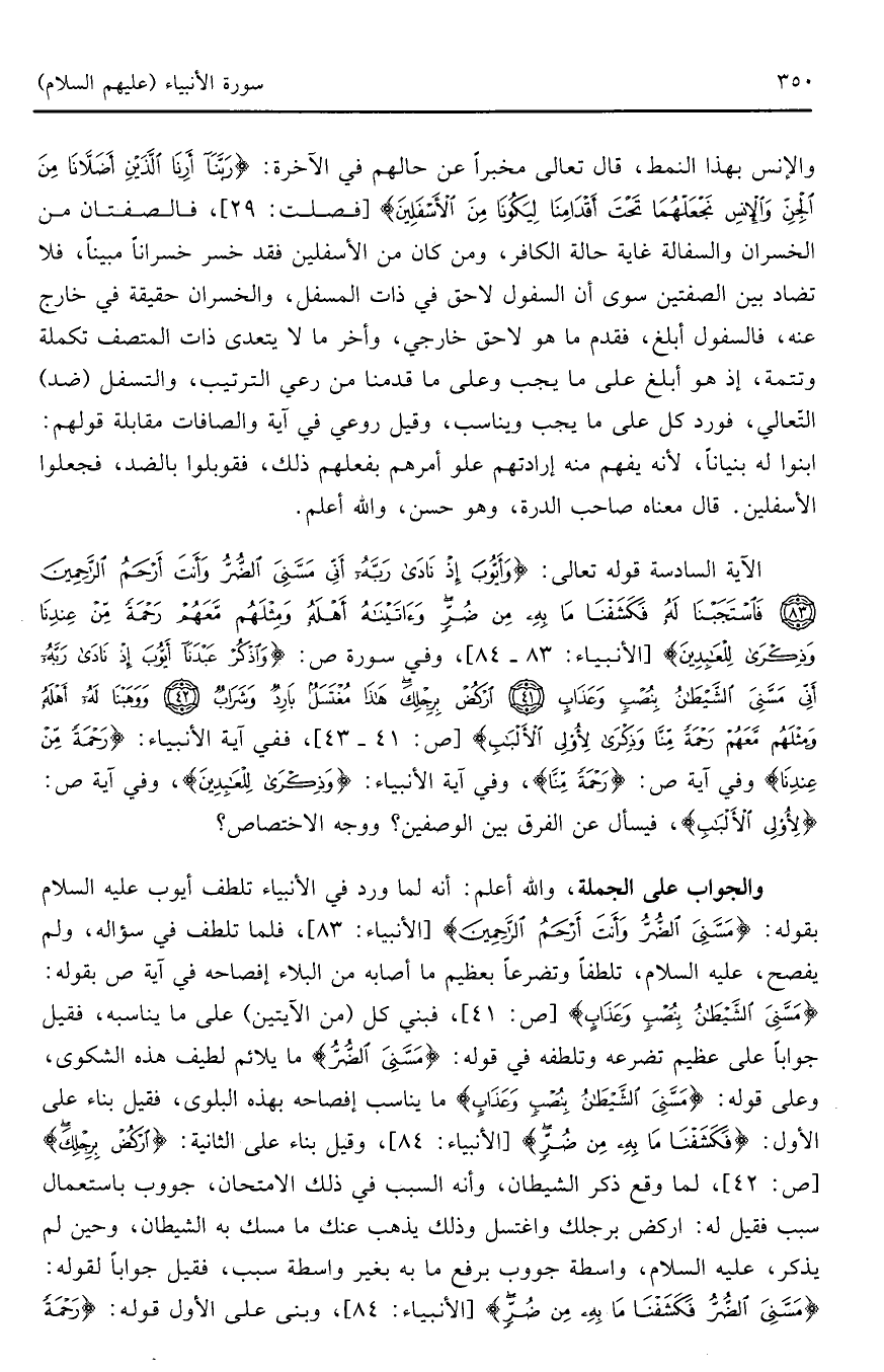 الآية السادسة قوله تعالى: (وَأَيُّوبَ إِذْ نَادَى رَبَّهُ أَنِّي مَسَّنِيَ الضُّرُّ وَأَنْتَ أَرْحَمُ الرَّاحِمِينَ * فَاسْتَجَبْنَا لَهُ فَكَشَفْنَا مَا بِهِ مِنْ ضُرٍّ وَآتَيْنَاهُ أَهْلَهُ وَمِثْلَهُمْ مَعَهُمْ رَحْمَةً مِنْ عِنْدِنَا وَذِكْرَى لِلْعَابِدِينَ) (الأنبياء: 83 - 84)، وفي سورة ص: (وَاذْكُرْ عَبْدَنَا أَيُّوبَ إِذْ نَادَى رَبَّهُ أَنِّي مَسَّنِيَ الشَّيْطَانُ بِنُصْبٍ وَعَذَابٍ * ارْكُضْ بِرِجْلِكَ هَذَا مُغْتَسَلٌ بَارِدٌ وَشَرَابٌ * وَوَهَبْنَا لَهُ أَهْلَهُ وَمِثْلَهُمْ مَعَهُمْ رَحْمَةً مِنَّا وَذِكْرَى لِأُولِي الْأَلْبَابِ) (ص: 41 - 43)، ففي آية الأنبياء: (رَحْمَةً مِنْ عِنْدِنَا) وفي آية ص: (رَحْمَةً مِنَّا)، وفي آية الأنبياء: (وَذِكْرَى لِلْعَابِدِينَ)، وفي آية ص: (لِأُولِي الْأَلْبَابِ)، فيسأل عن الفرق بين الوصفين؟ ووجه الاختصاص؟