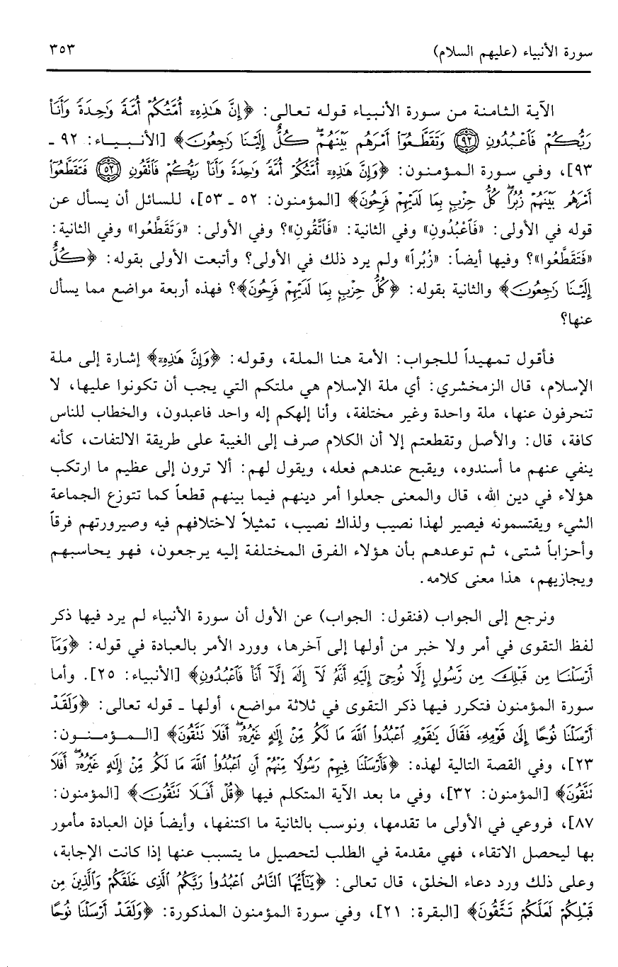 الآية الثامنة من سورة الأنبياء قوله تعالى: (إِنَّ هَذِهِ أُمَّتُكُمْ أُمَّةً وَاحِدَةً وَأَنَا رَبُّكُمْ فَاعْبُدُونِ * وَتَقَطَّعُوا أَمْرَهُمْ بَيْنَهُمْ كُلٌّ إِلَيْنَا رَاجِعُونَ) (الأنبياء: 92 - 93)، وفي سورة المؤمنون: (وَإِنَّ هَذِهِ أُمَّتُكُمْ أُمَّةً وَاحِدَةً وَأَنَا رَبُّكُمْ فَاتَّقُونِ * فَتَقَطَّعُوا أَمْرَهُمْ بَيْنَهُمْ زُبُرًا كُلُّ حِزْبٍ بِمَا لَدَيْهِمْ فَرِحُونَ) (المؤمنون: 52 - 53)، للسائل أن يسأل عن قوله في الأولى: (فَاعْبُدُونِ) وفي الثانية: (فَاتَّقُونِ)؟ وفي الأولى: (وَتَقَطَّعُوا) وفي الثانية (فَتَقَطَّعُوا)؟ وفيها أيضاً: (زُبُرًا) ولم يرد في الأولى؟ وأتبعت الأولى بقوله: (كُلٌّ إِلَيْنَا رَاجِعُونَ) والثانية بقوله: (كُلُّ حِزْبٍ بِمَا لَدَيْهِمْ فَرِحُونَ)؟ فهذه أربعة مواضع مما يسأل عنها؟