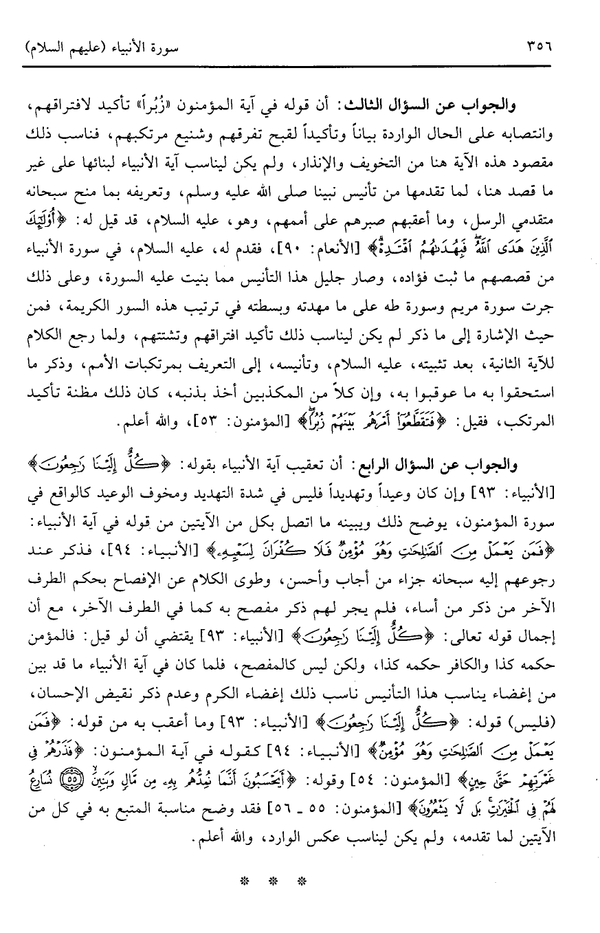 والجواب عن السؤال الثالث: أن قوله في آية المؤمنون (زُبرا) تأكيد لافتراقهم، وانتصابه على الحال الواردة بياناً وتأكيداً لقبح تفرقهم وشنيع مرتكبيهم، فناسب ذلك مقصود هذه الآية هنا من التخويف والإنذار، ولم يكن ليناسب آية الأنبياء لبنائها على غير ما قصد هنا، لما تقدمها من تأنيس نبينا صلى الله عليه وسلم، وتعريفه بما منح سبحانه متقدمي الرسل، وما أعقبهم صبرهم على أممهم، وهو، عليه السلام، قد قيل له: (أُولَئِكَ الَّذِينَ هَدَى اللَّهُ فَبِهُدَاهُمُ اقْتَدِهْ) (الأنعام: 90)، فقدم له، عليه السلام، في سورة الأنبياء من قصصهم ما ثبت فؤاده، وصار جليل هذا التأنيس مما بنيت عليه السورة، وعلى ذلك جرت سورة مريم وسورة طه على ما مهدته وبسطته في ترتيب هذه السور الكريمة، فمن حيث الإشارة إلى ما ذكر لم يكن ليناسب ذلك تأكيد افتراقهم وتشتتهم، ولما رجع الكلام للآية الثانية، بعد تثبيته، عليه السلام، وتأنيسه، إلى التعريف بمرتكبات الأمم، وذكر ما استحقوا به ما عوقبوا به، وإن كلاً من المكذبين أخذ بذنبه، كان ذلك مظنة تأكيد المرتكب، فقيل: (فَتَقَطَّعُوا أَمْرَهُمْ بَيْنَهُمْ زُبُرًا) (المؤمنون: 53)، والله أعلم.
